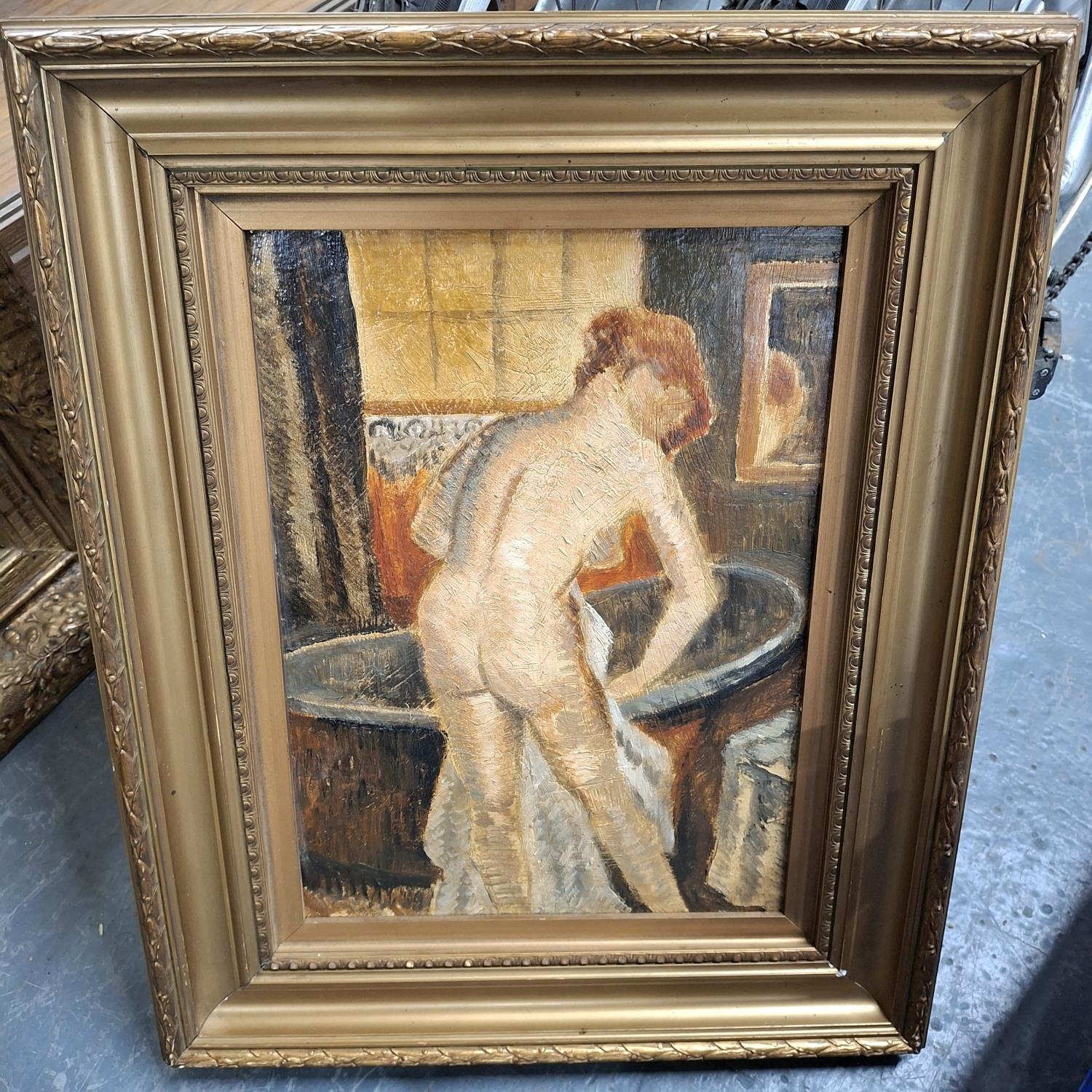 Unsigned early 20thC Camden School oil on board painting of a nude female in an interior, gilt framed. The oil measures 35 x 25 cm