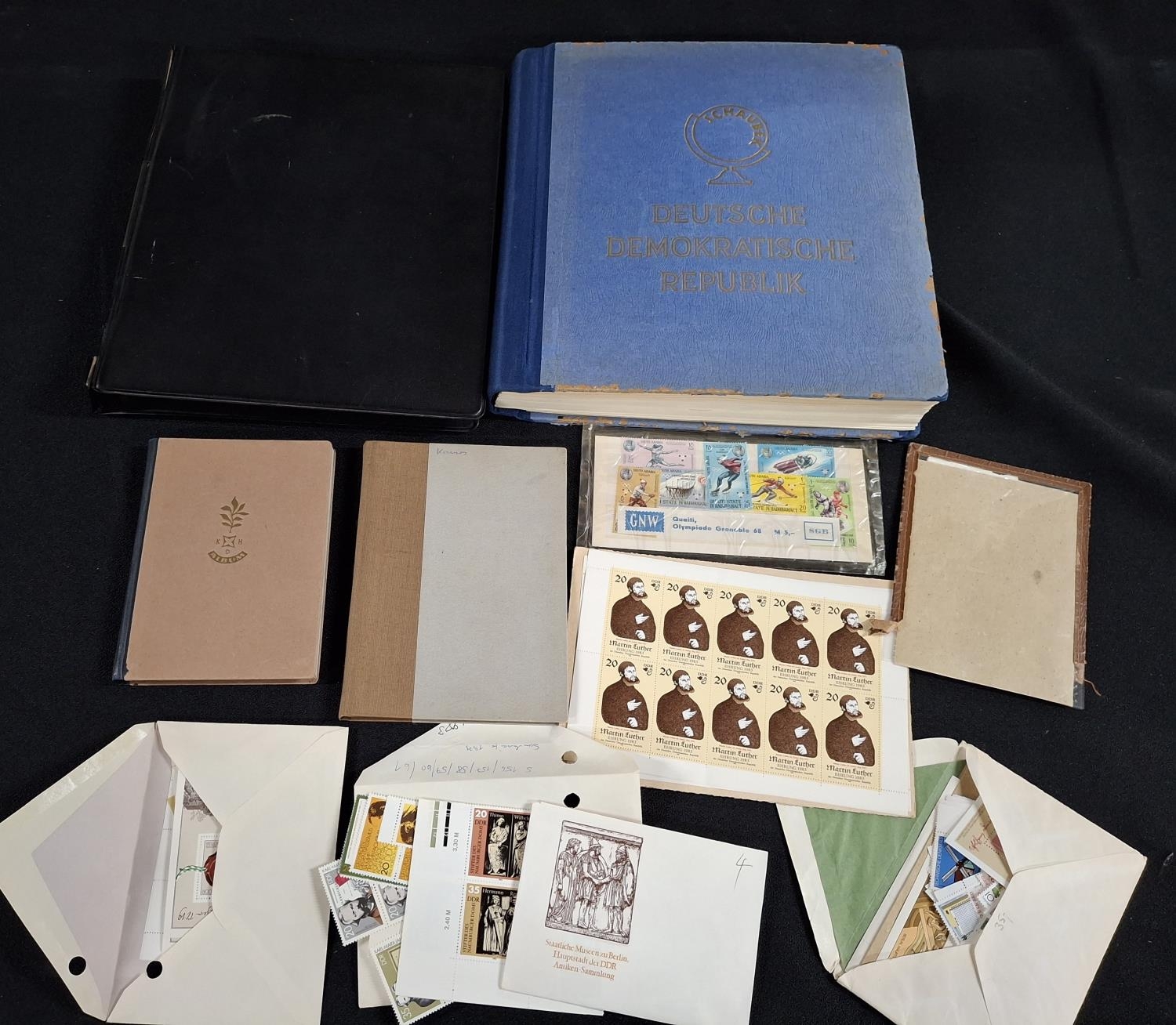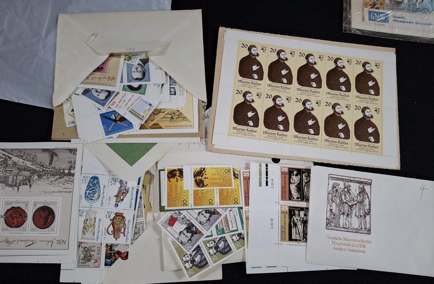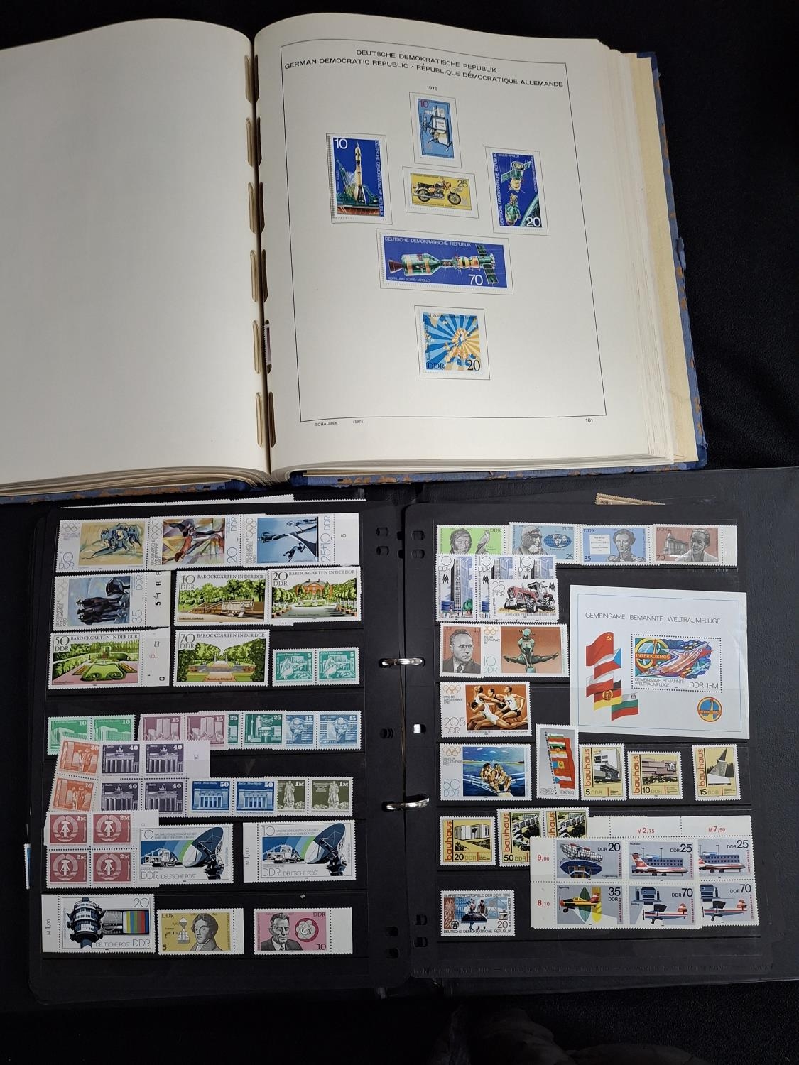 Huge quantity of Mint unmounted and unused mounted East Germany (DDR) stamps and 2 small other mixed albums. The black album contains DDR mint unmounted 1965-c1980 possibly complete and the blue album containing unused mounted sets 1968-1980, large quantity, possibly complete together with a quantity of loose MU strips and mini sheets from this period (Qty)