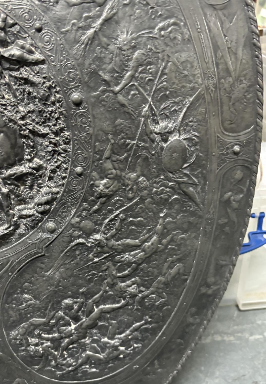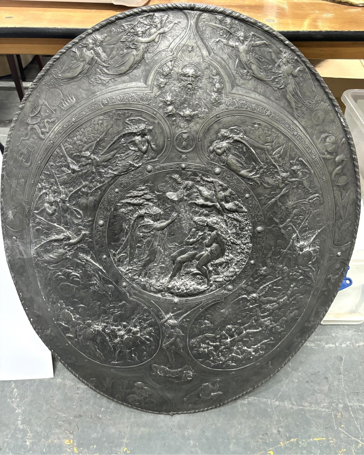 Large solid lead oval shield, stamped to the Delens foundry, Belgium after the original by Morel-Ladeuil, Léonard (French, 1820-1888), The shield measures approx 83 x 62 cm