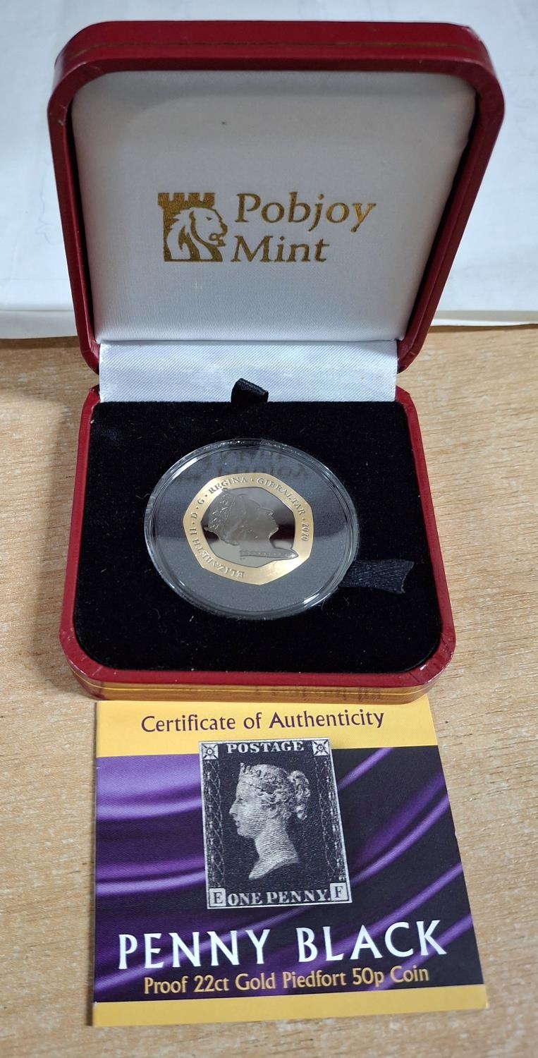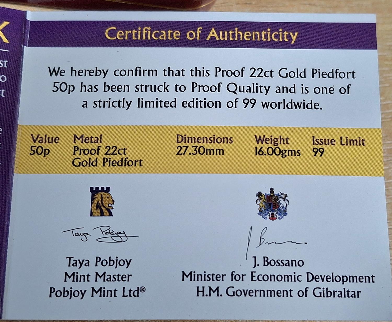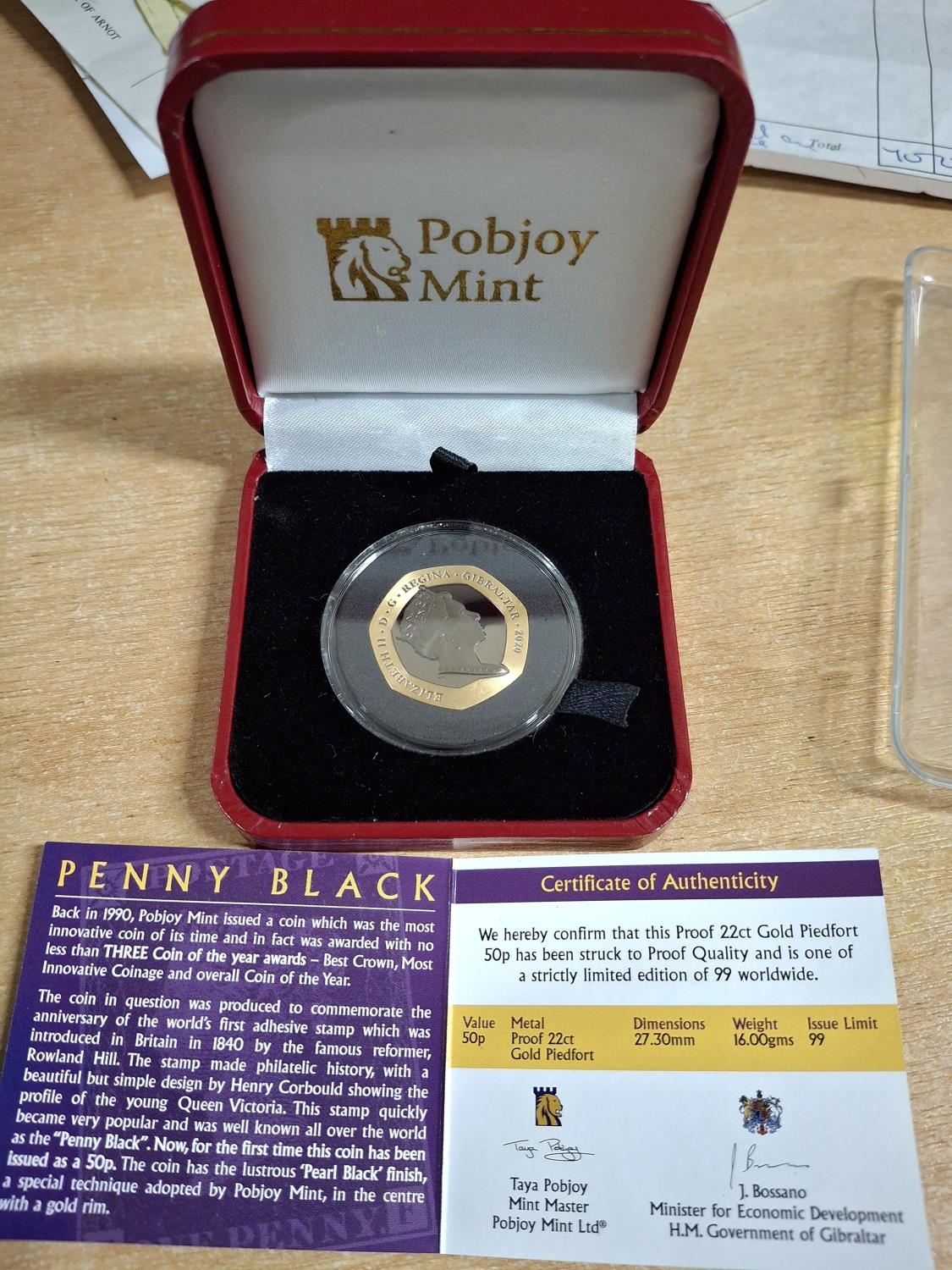 Gibraltar 2020 22ct gold limited edition (99) proof piedfort “Penny Black” 50p produced by the Pobjoy Mint in plastic protective casing and red case, 16 grams 27.30mm diameter