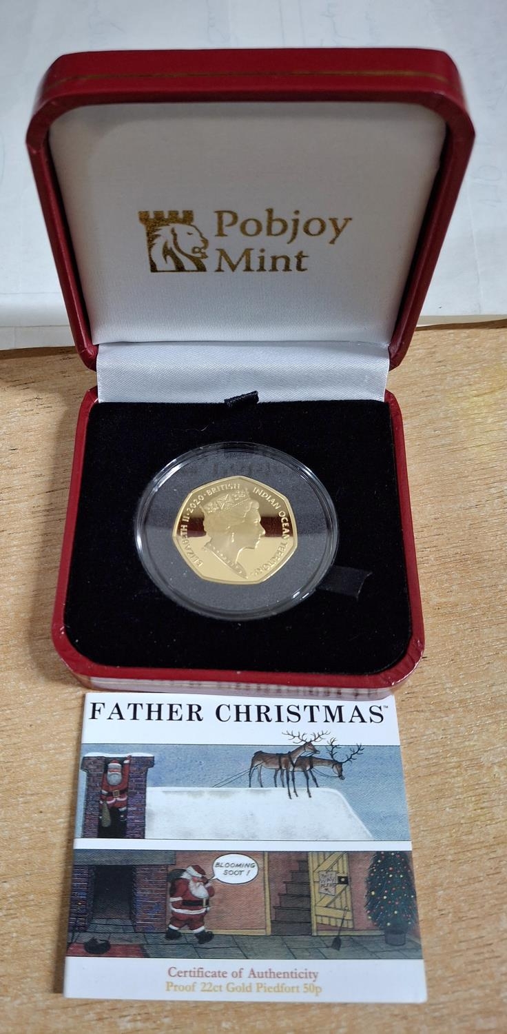 British Indian Ocean Territory 2020 22ct gold limited edition (99) proof piedfort “Father Christmas” 50p produced by the Pobjoy Mint, in clear plastic casing and in a red case