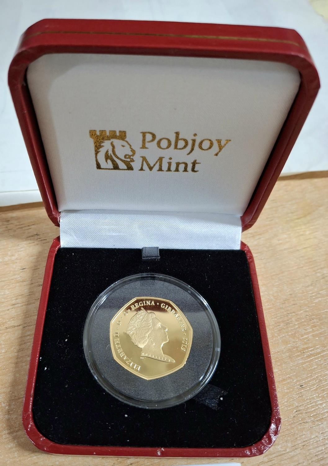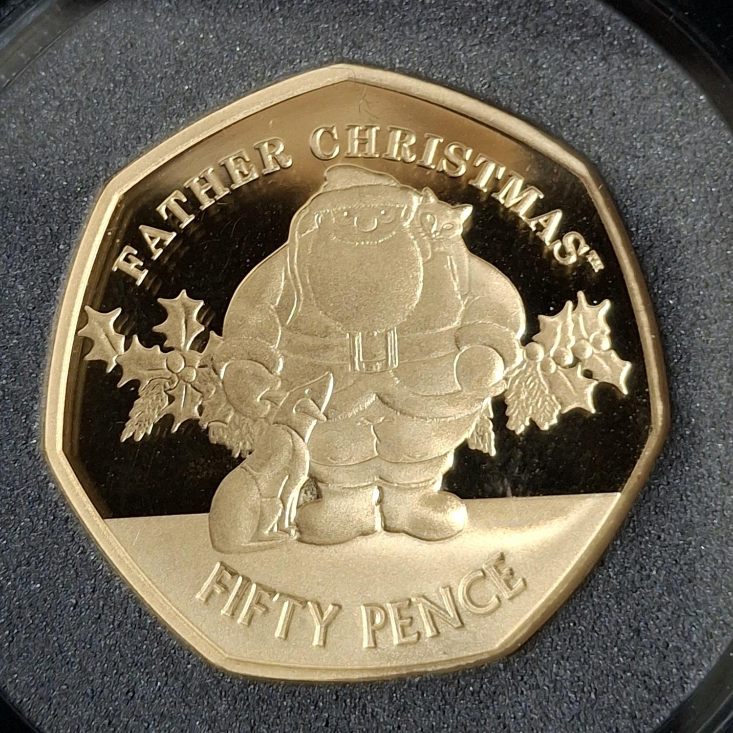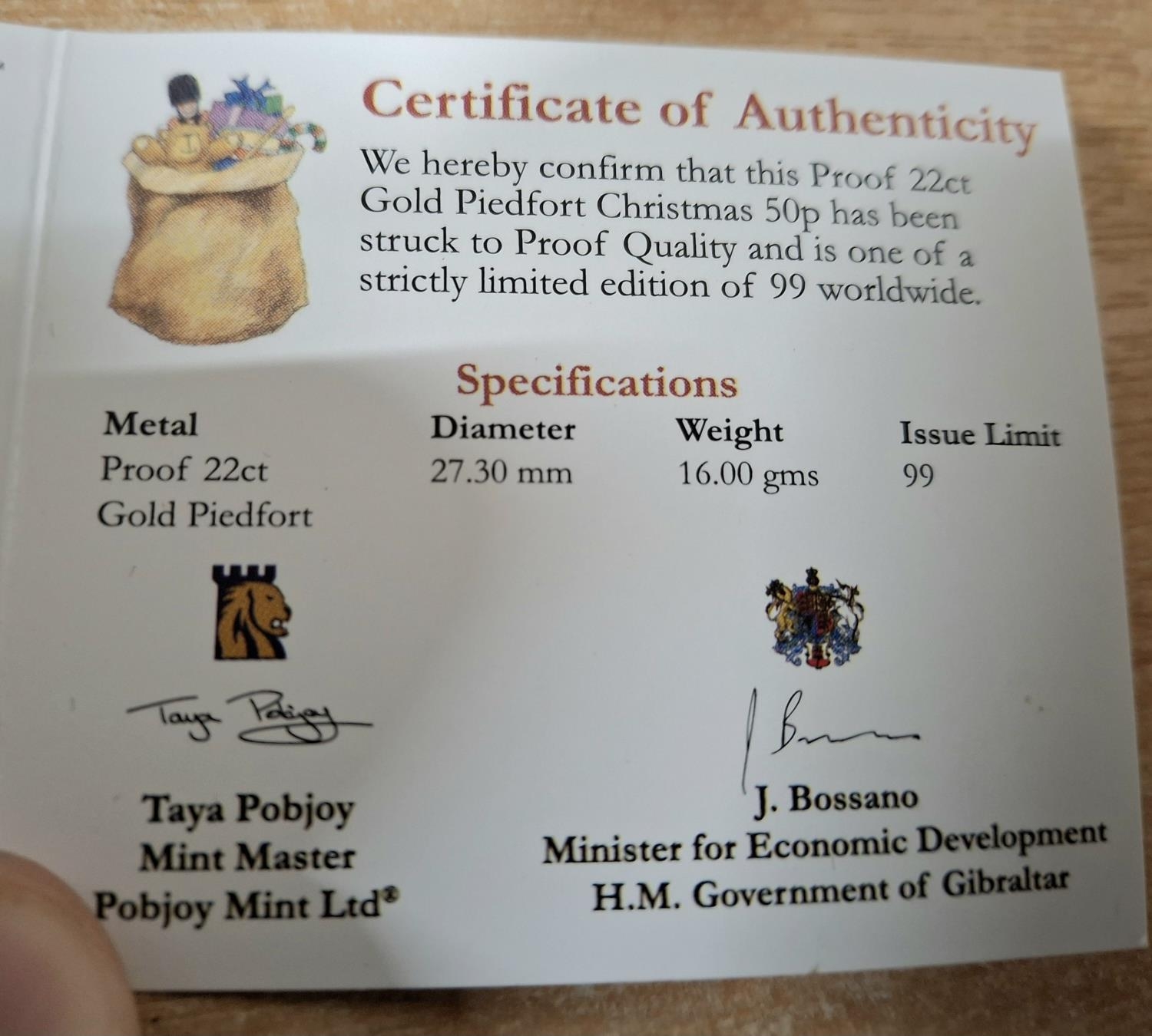 Gibraltar 2019 22ct gold limited edition (99) proof piedfort “Father Christmas” 50p produced by the Pobjoy Mint, in clear plastic casing and in a red case 16 grams 27.3mm diameter