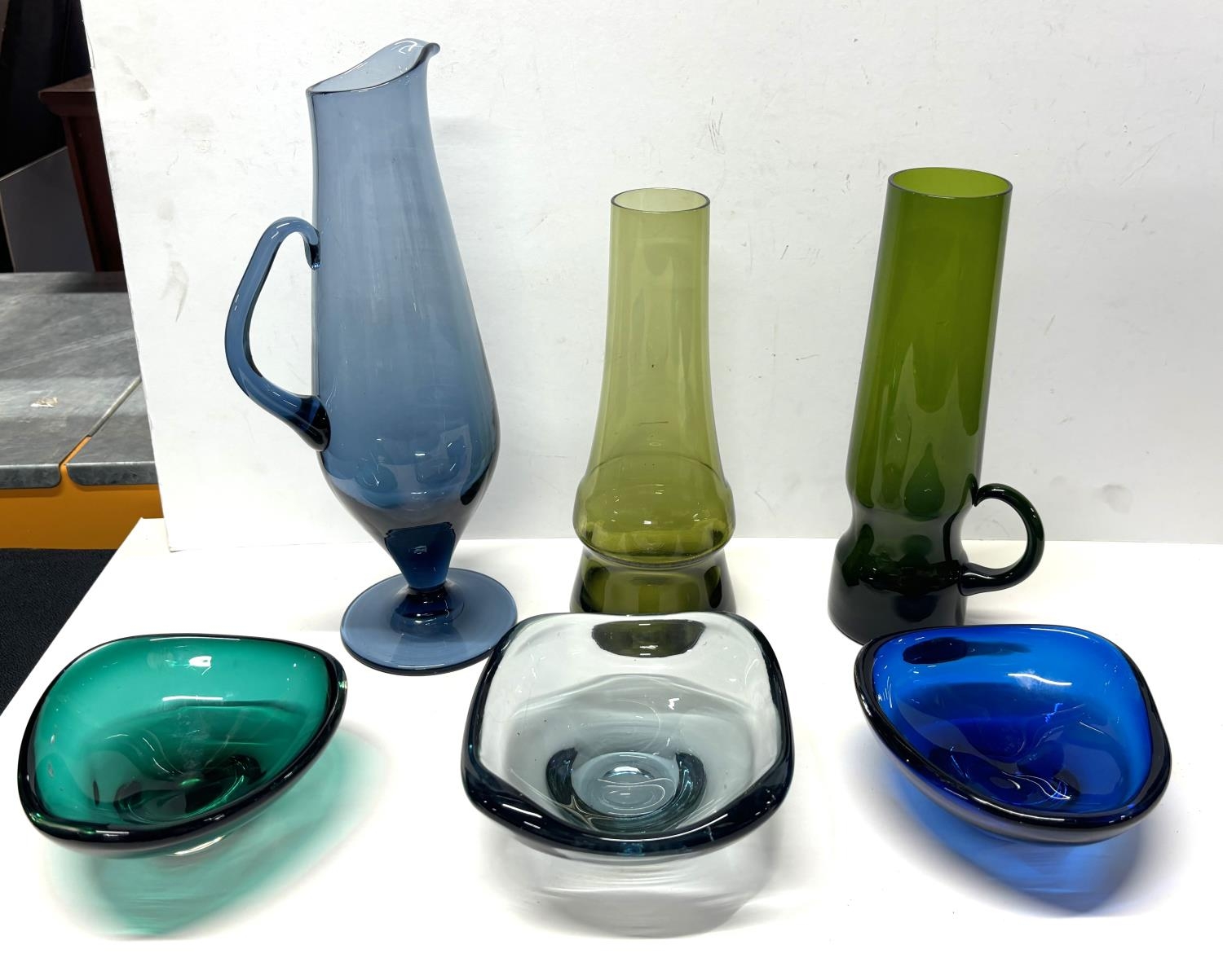 Three Scandinavian coloured glass jars together with 3 coloured glass bowls by Whitefriers (6)