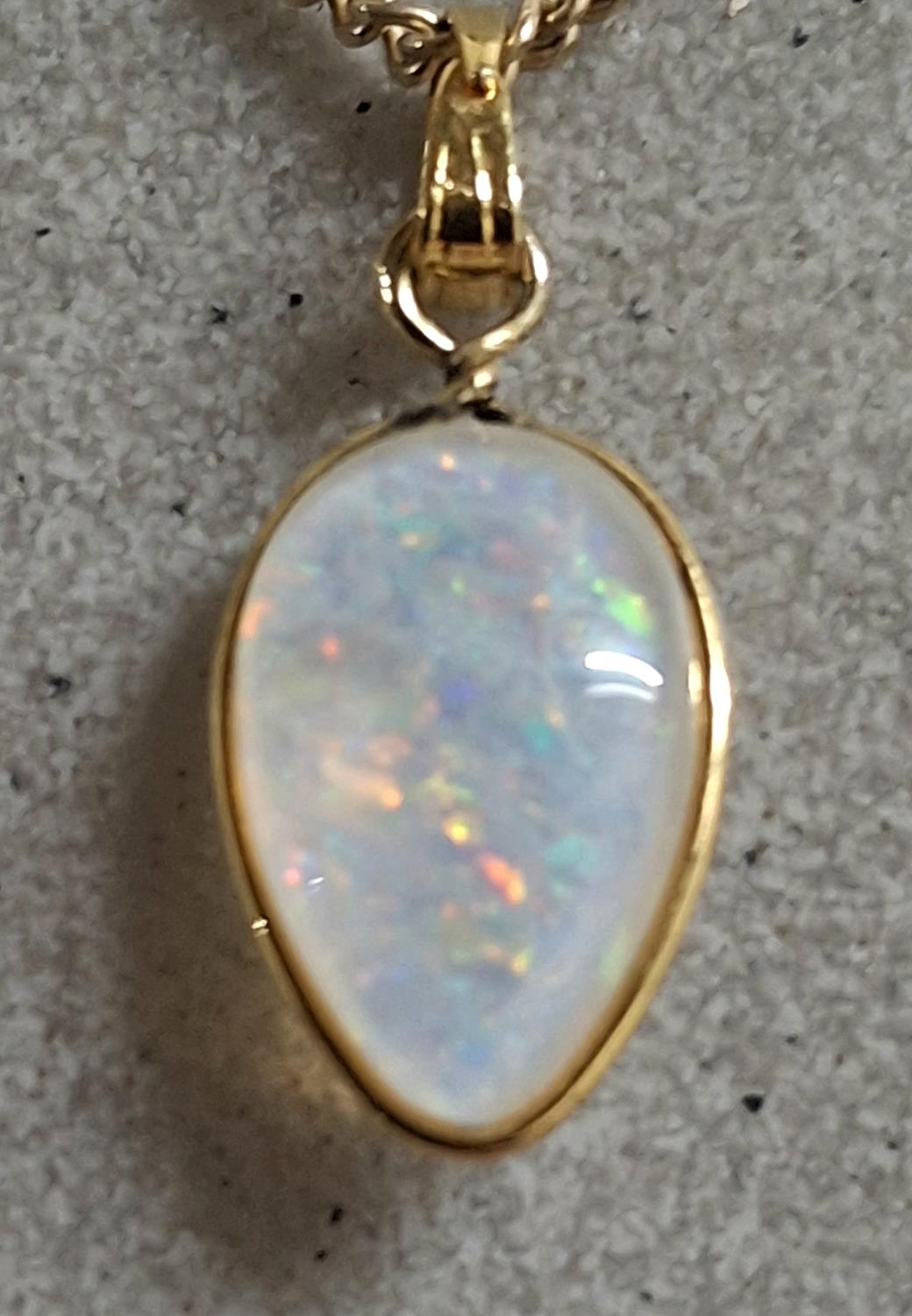 Large whole Opal pendant in teardrop form set in 9ct yellow gold and comes on a hallmarked 9ct yellow gold fine chain, 4.1 grams gross
