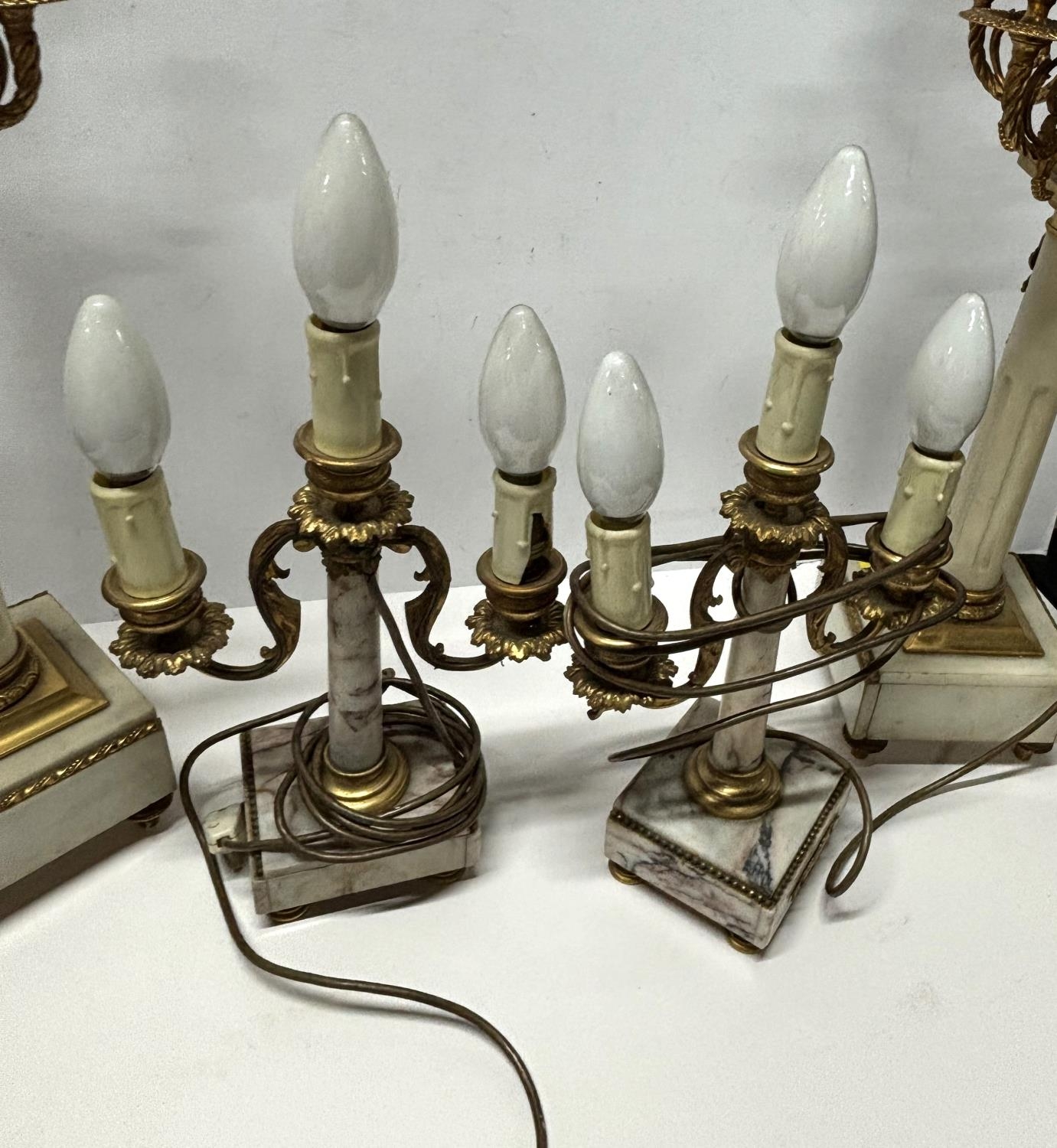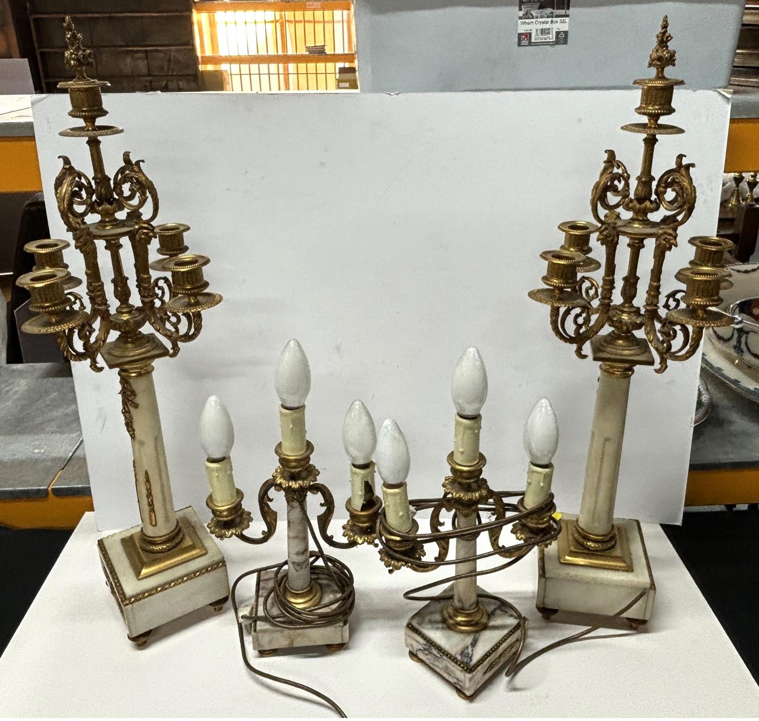 Pair of mid 20thC, tall ornate brass candle holders in the French classical style, other with a matching pair of electric table lamps (4)