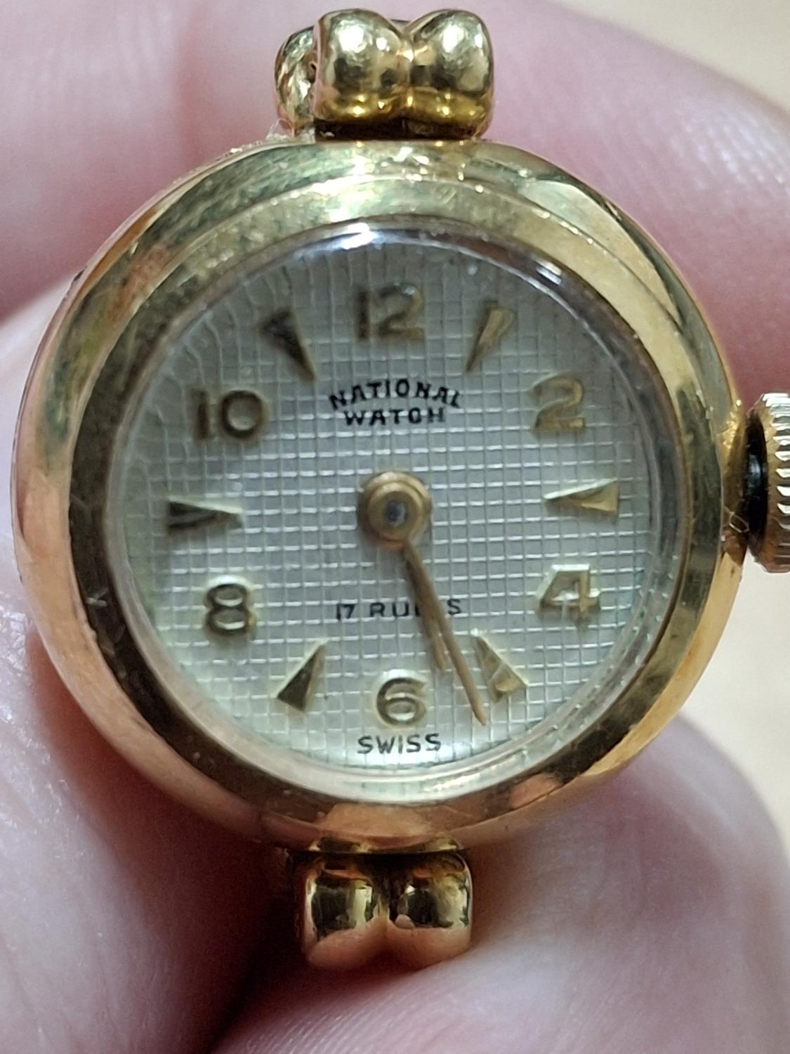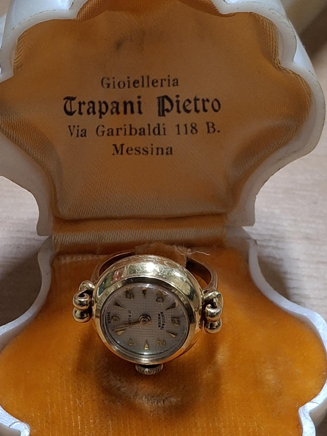 Swiss made 18ct gold finger watch ” Natural watch co” with original box from Messina Italy. Weight 12.6g