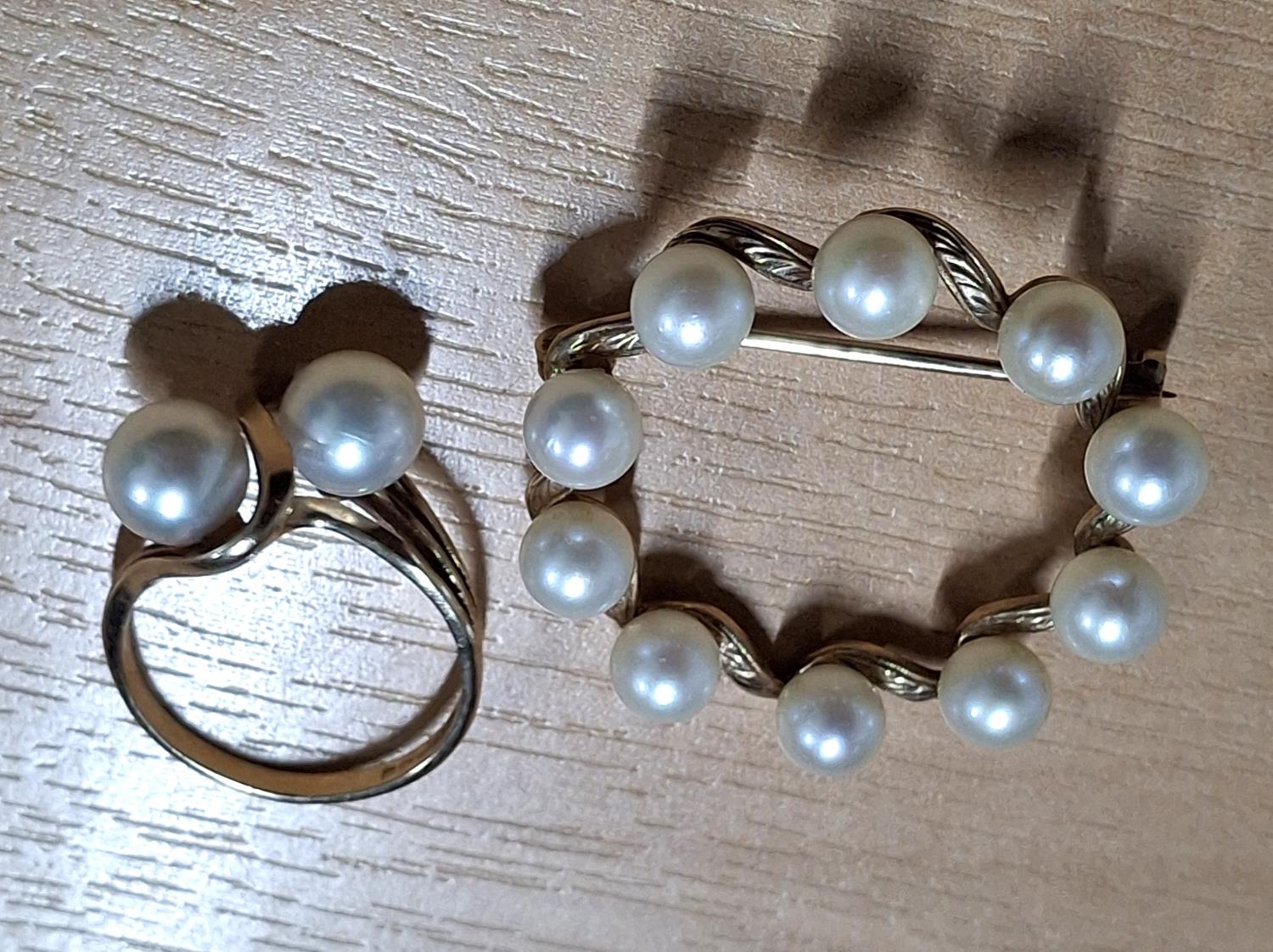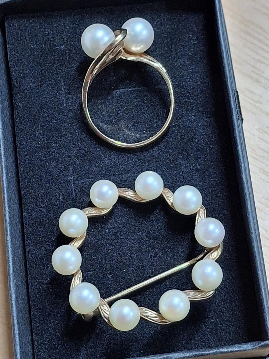 9ct Gold and pearl brooch with associated 9ct gold and pearl ring (2), 9.5 grams gross