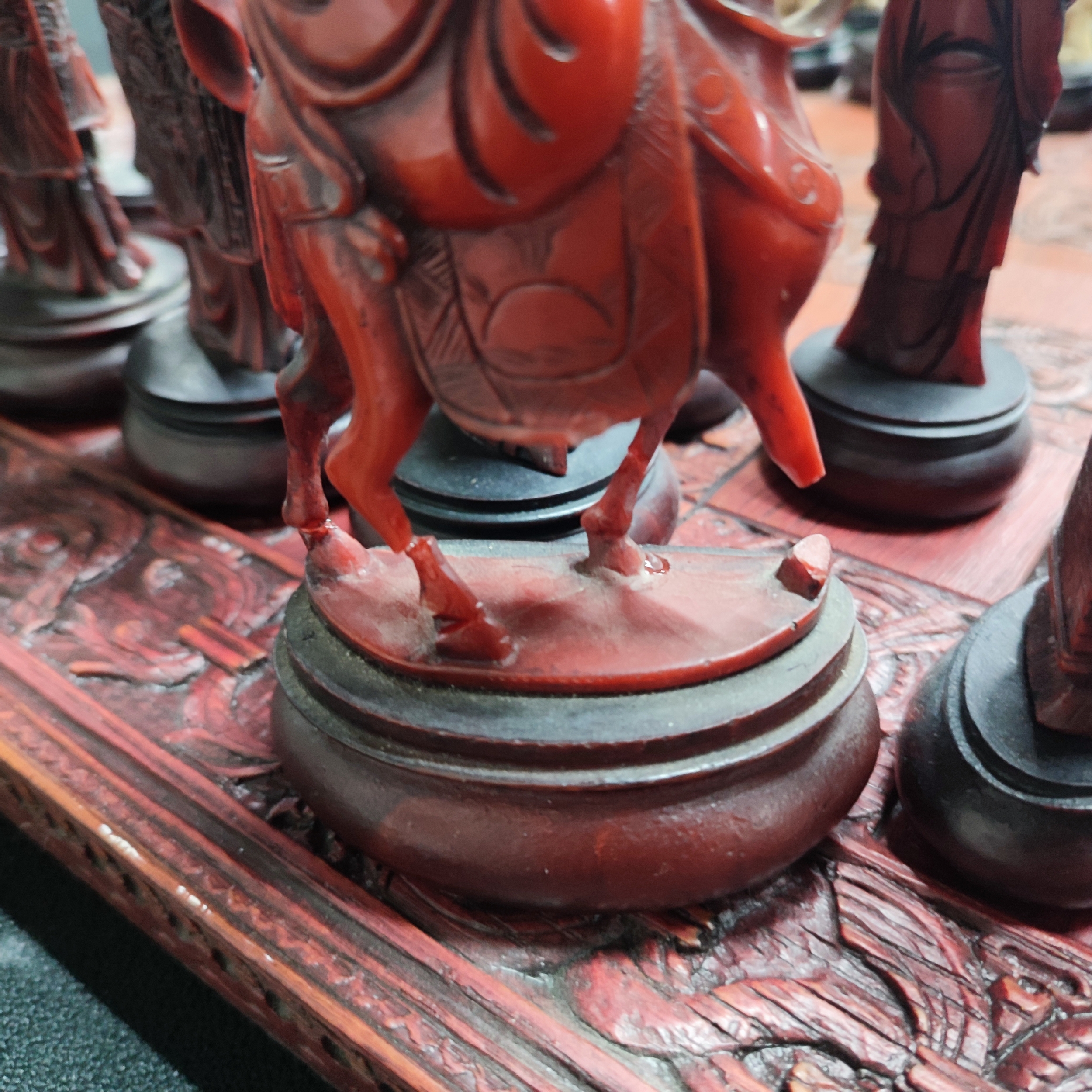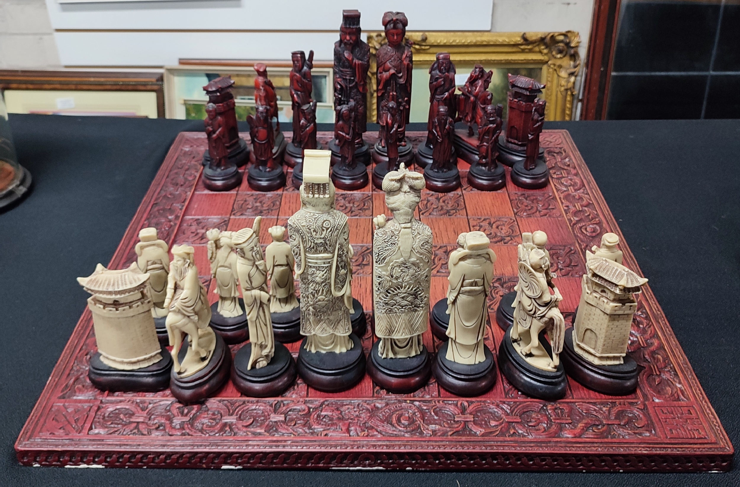 Chess set depicting characters from an oriental dynasty period, repair to one rook