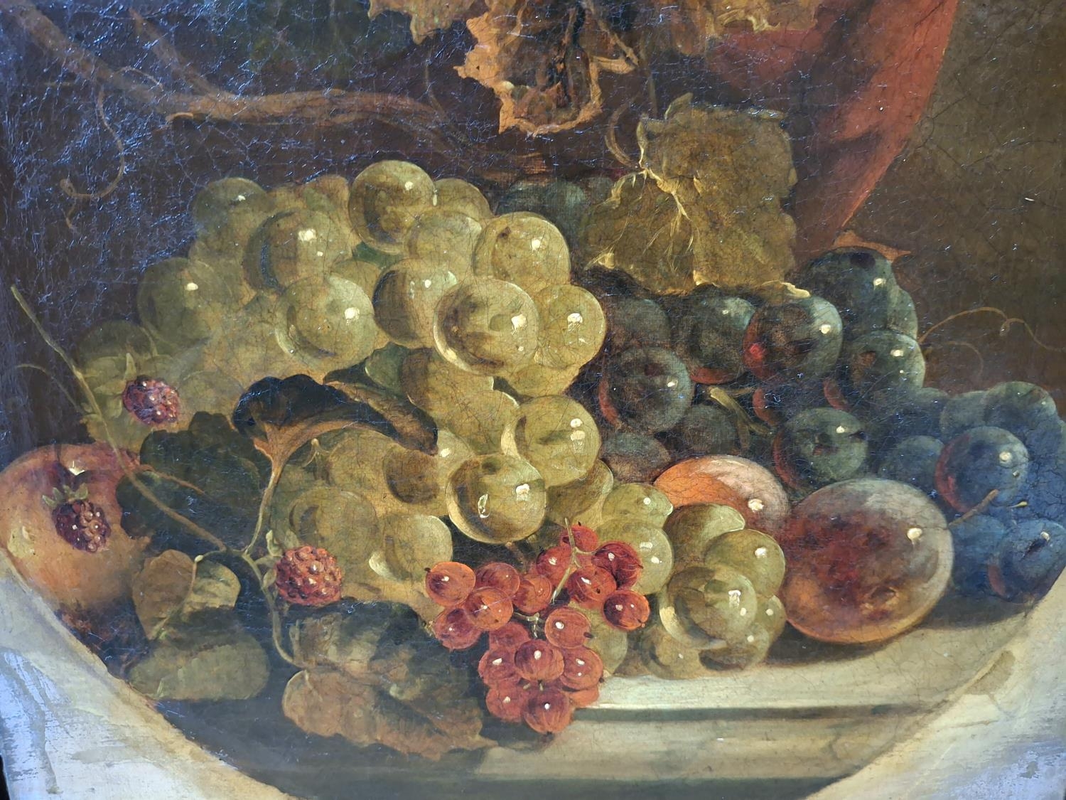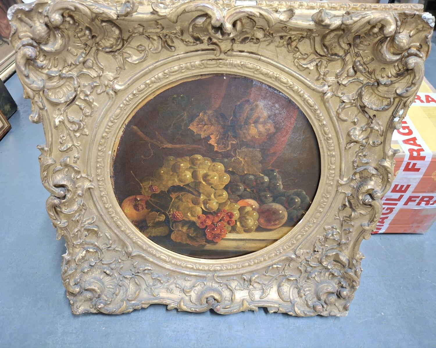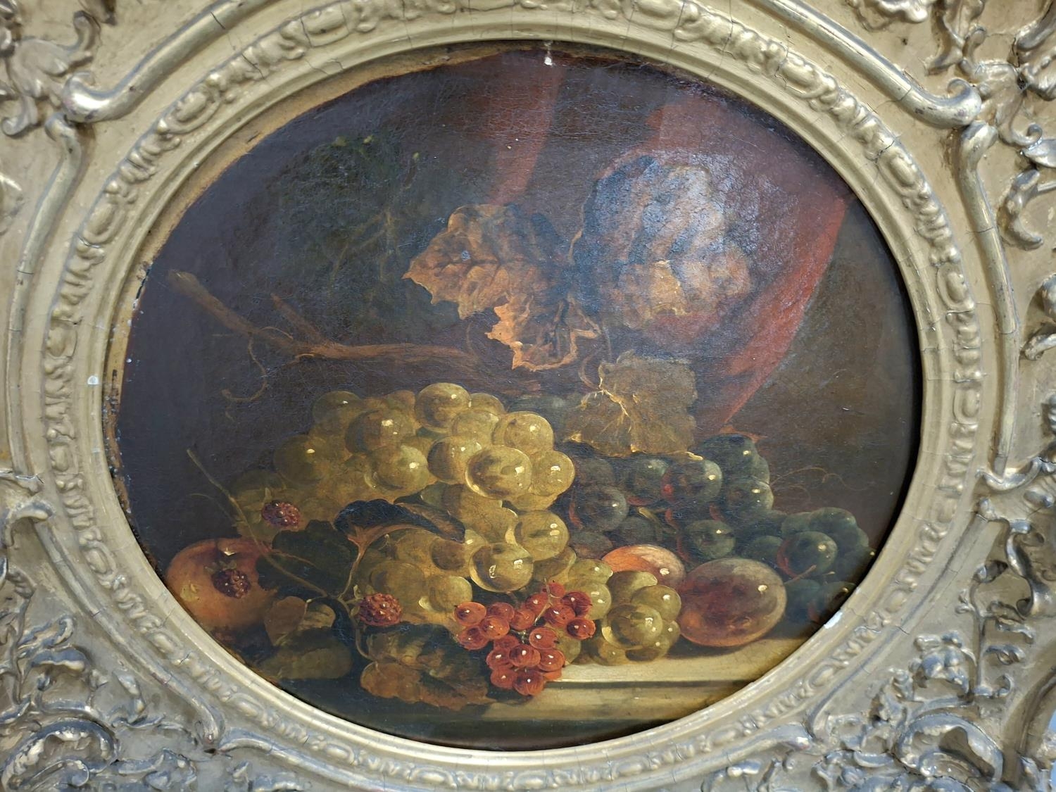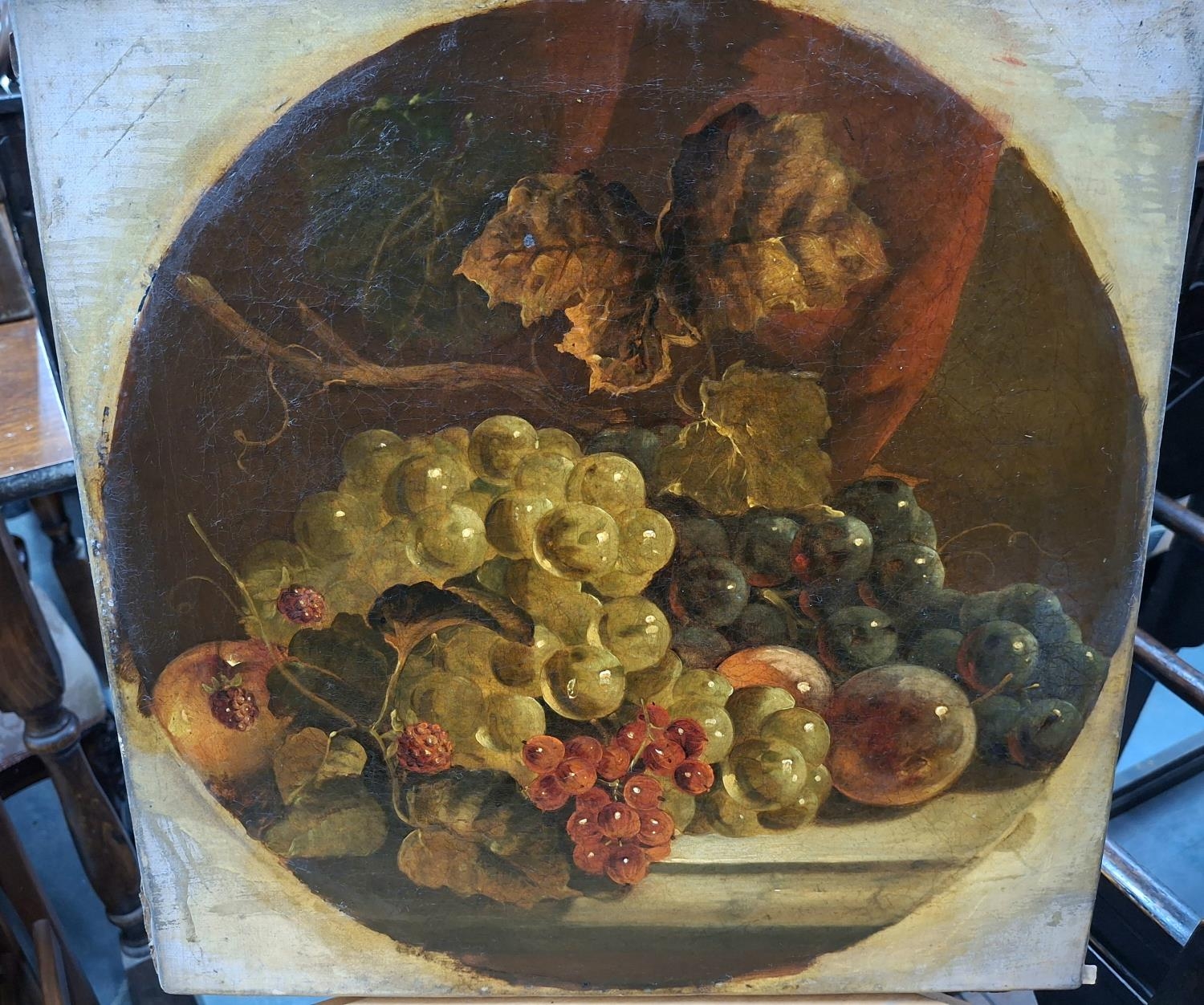 Circle of George CLARE (1830-1900), indistinctly signed, late Victorian still-life oil of fruit in foliage set in a fained circle and housed in its superb, original purpose-made, ornate, gesso frame