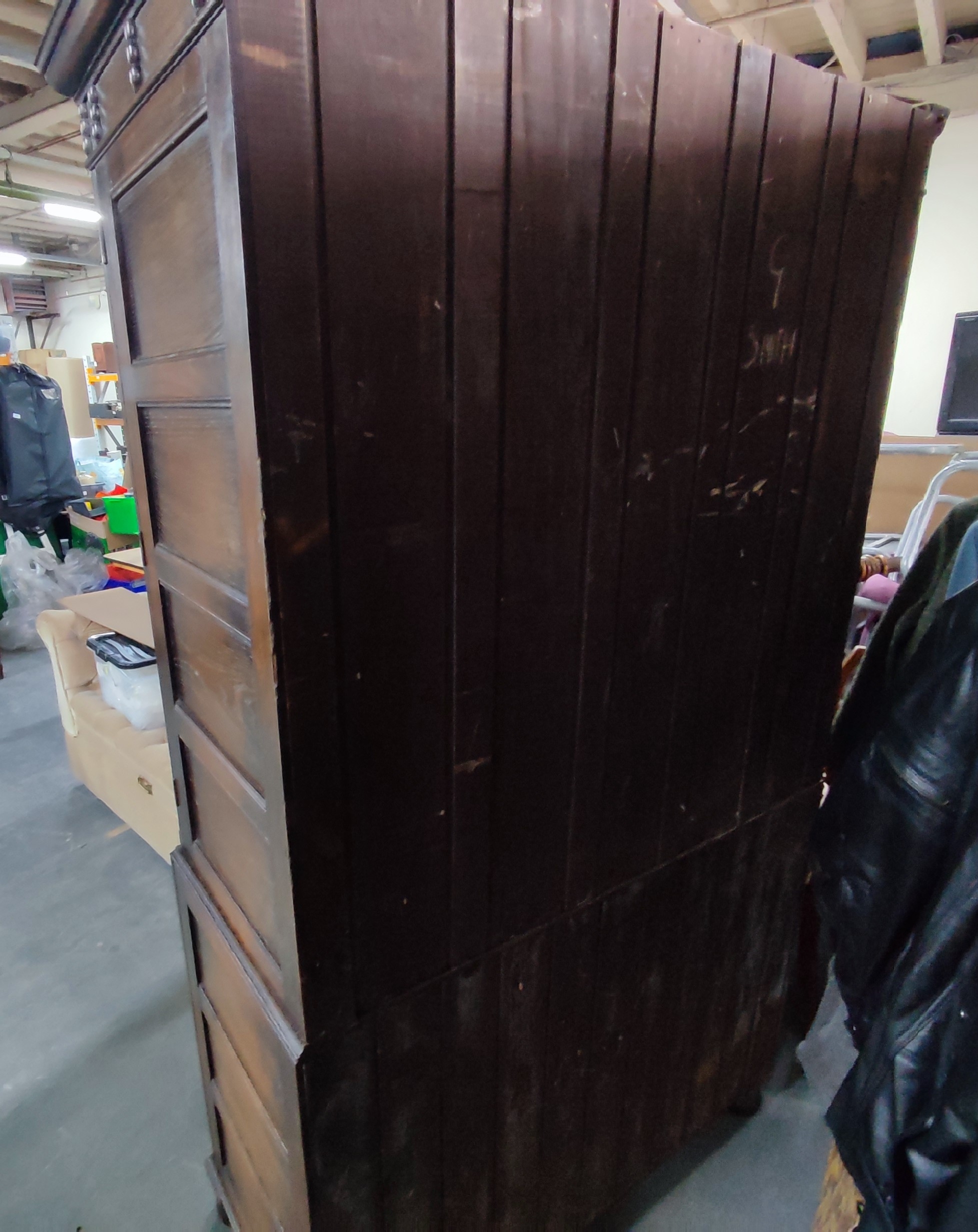 A stunning antique linen press cupboard with two doors revealing three inner slide-out linen drawers, above three drawers with Brass escutcheons and handles, situated on four bun feet, circa – late 19th.C. / early 20th.C., L-114 x W-52 x H-200cm