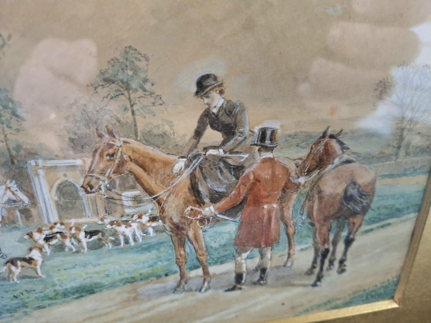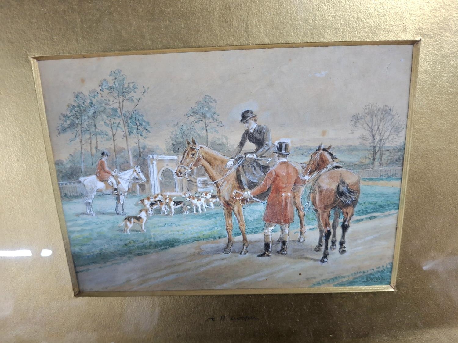 Alfred W. COOPER (19thC British) watercolour “Before the hunt” in original gilt mount and frame, The w/c measures 14 x 19 cm