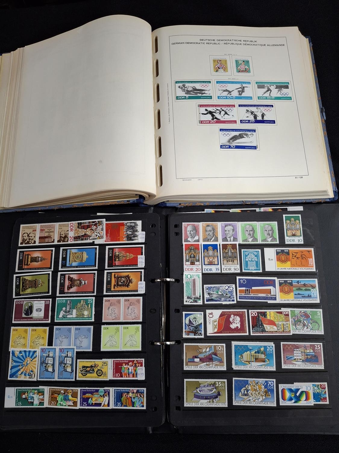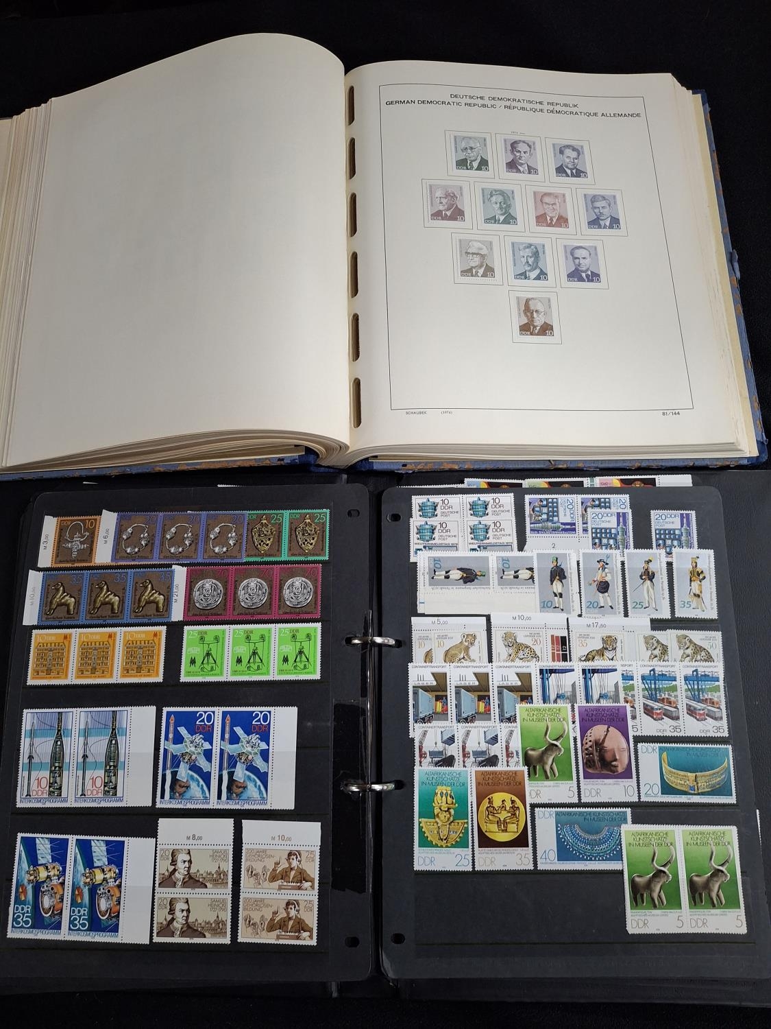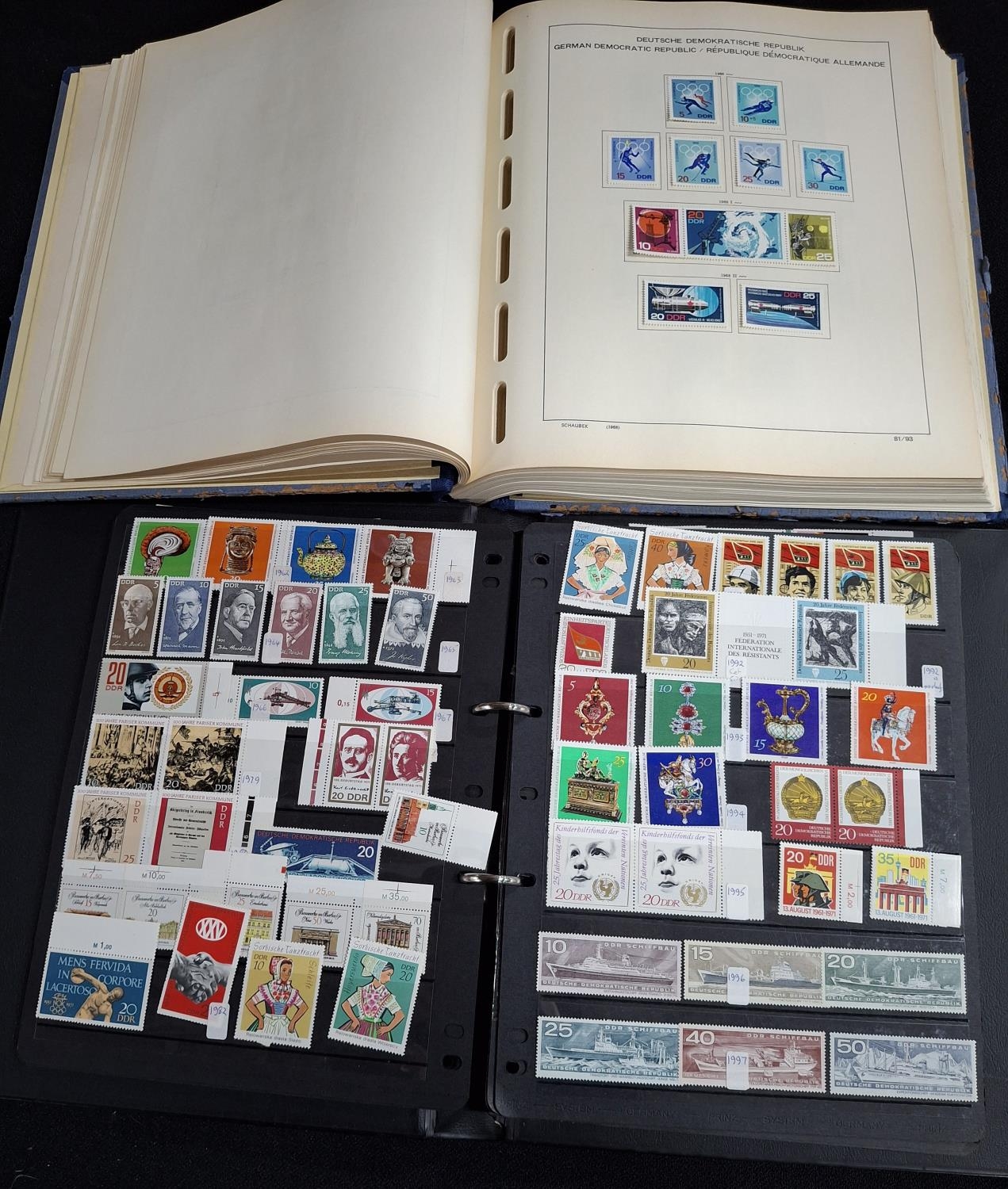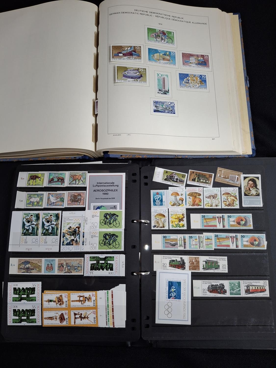 Huge quantity of Mint unmounted and unused mounted East Germany (DDR) stamps and 2 small other mixed albums. The black album contains DDR mint unmounted 1965-c1980 possibly complete and the blue album containing unused mounted sets 1968-1980, large quantity, possibly complete together with a quantity of loose MU strips and mini sheets from this period (Qty)