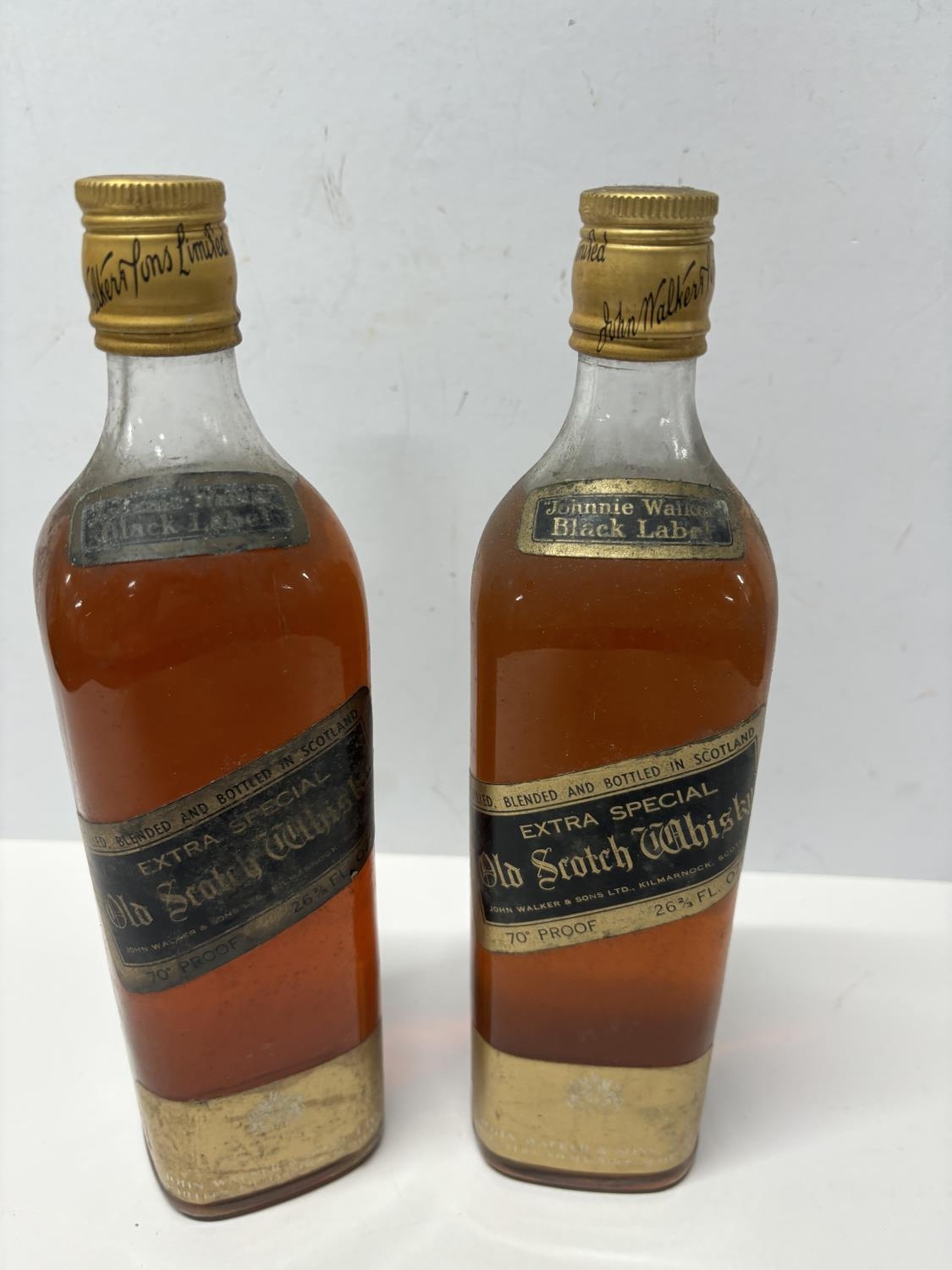 Two slightly different 1960s/70s bottles of Johnnie Walker black label Scotch whiskey (2), Both 26 2/3 fl oz both 70% proof