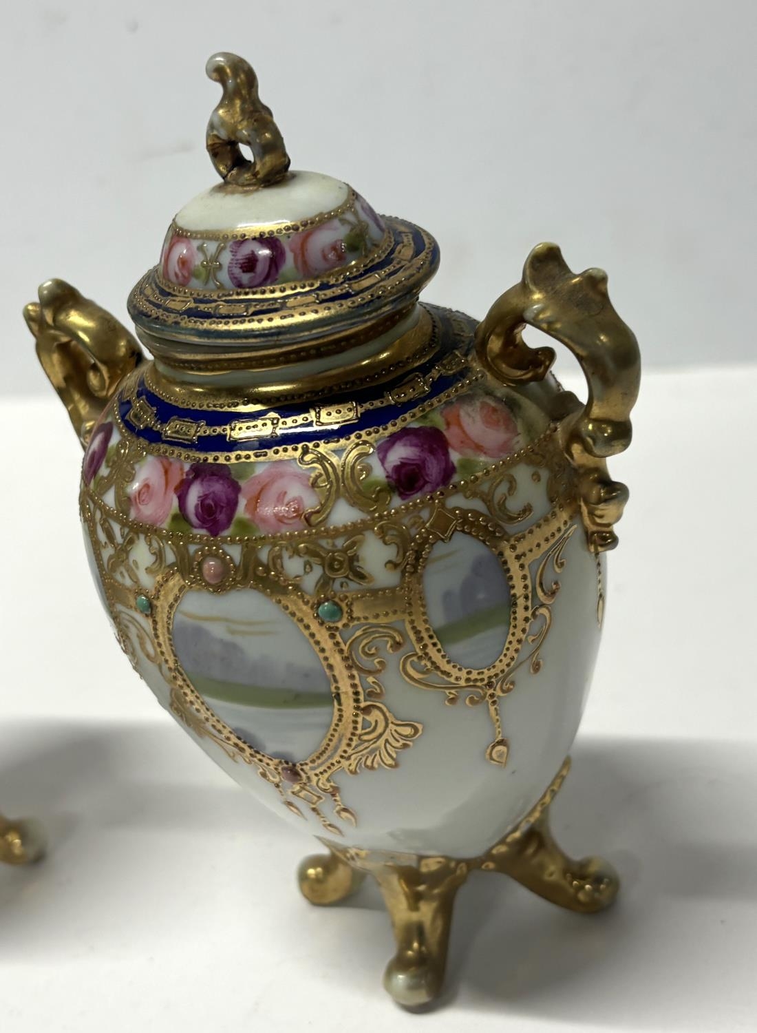 Pair of antique Noritake porcelain ovoid small lidded vases with hand painted decoration (2)