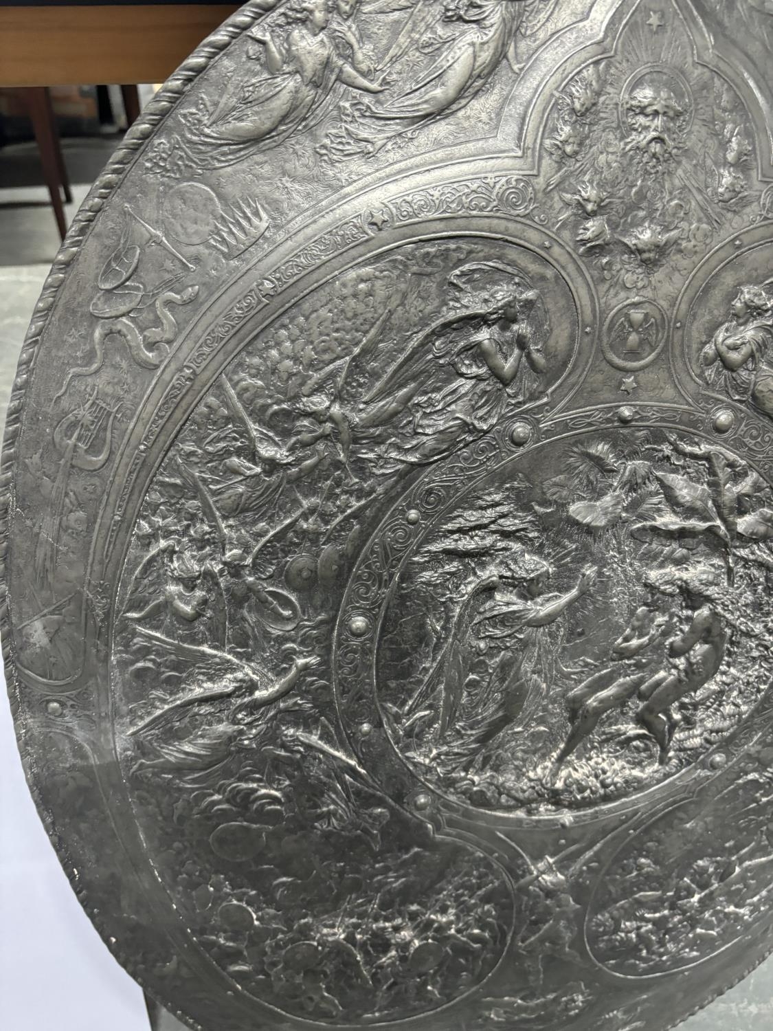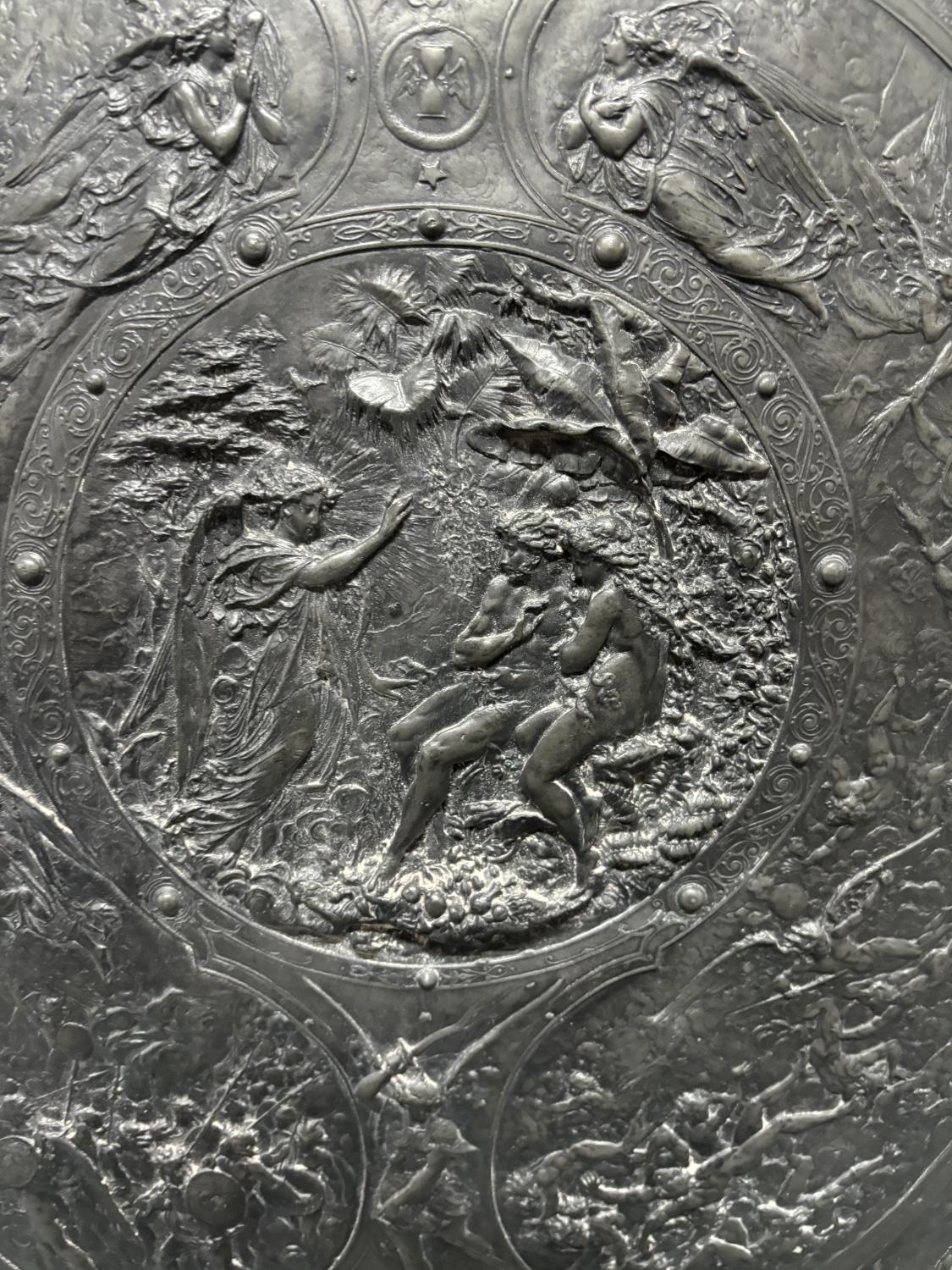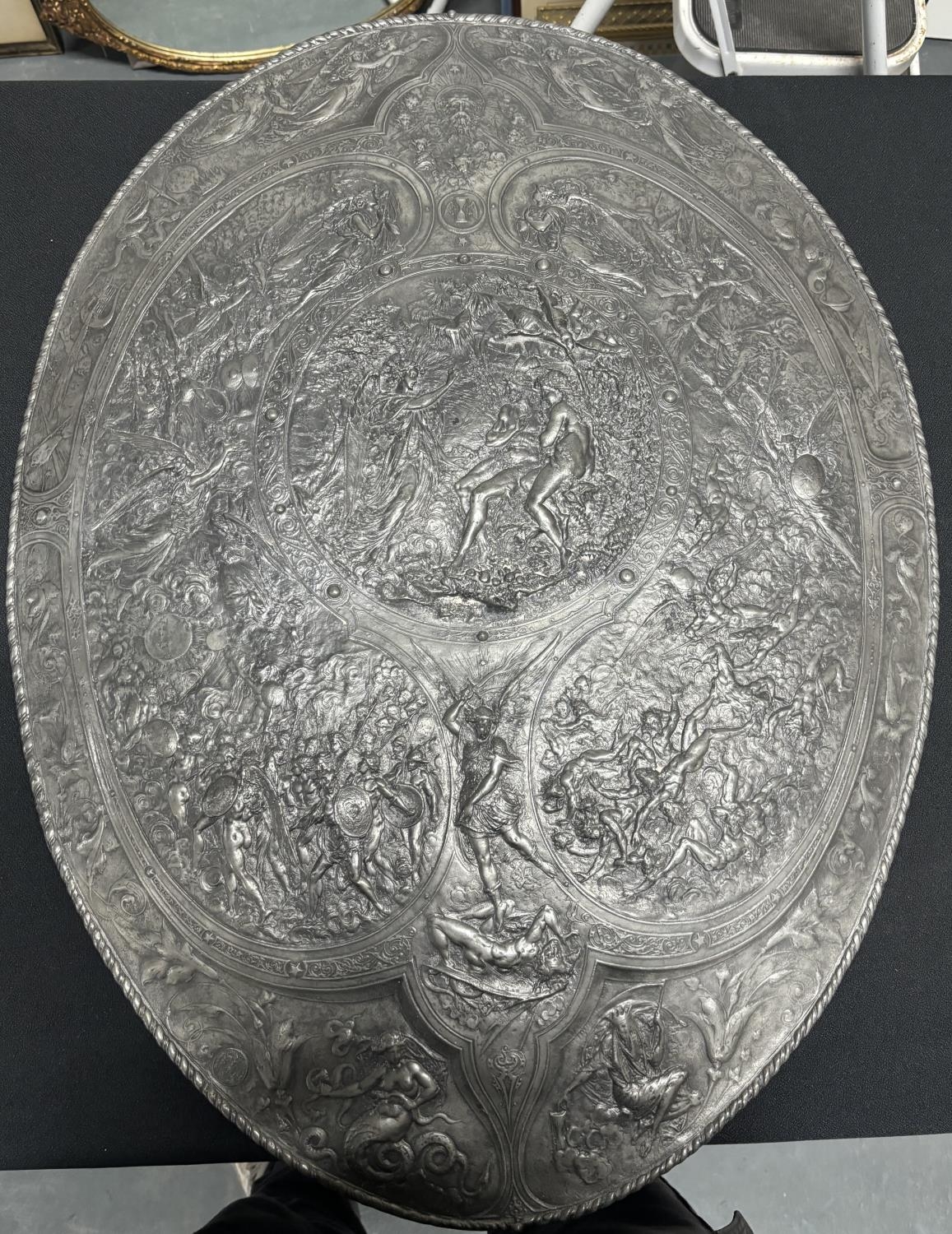 Large solid lead oval shield, stamped to the Delens foundry, Belgium after the original by Morel-Ladeuil, Léonard (French, 1820-1888), The shield measures approx 83 x 62 cm