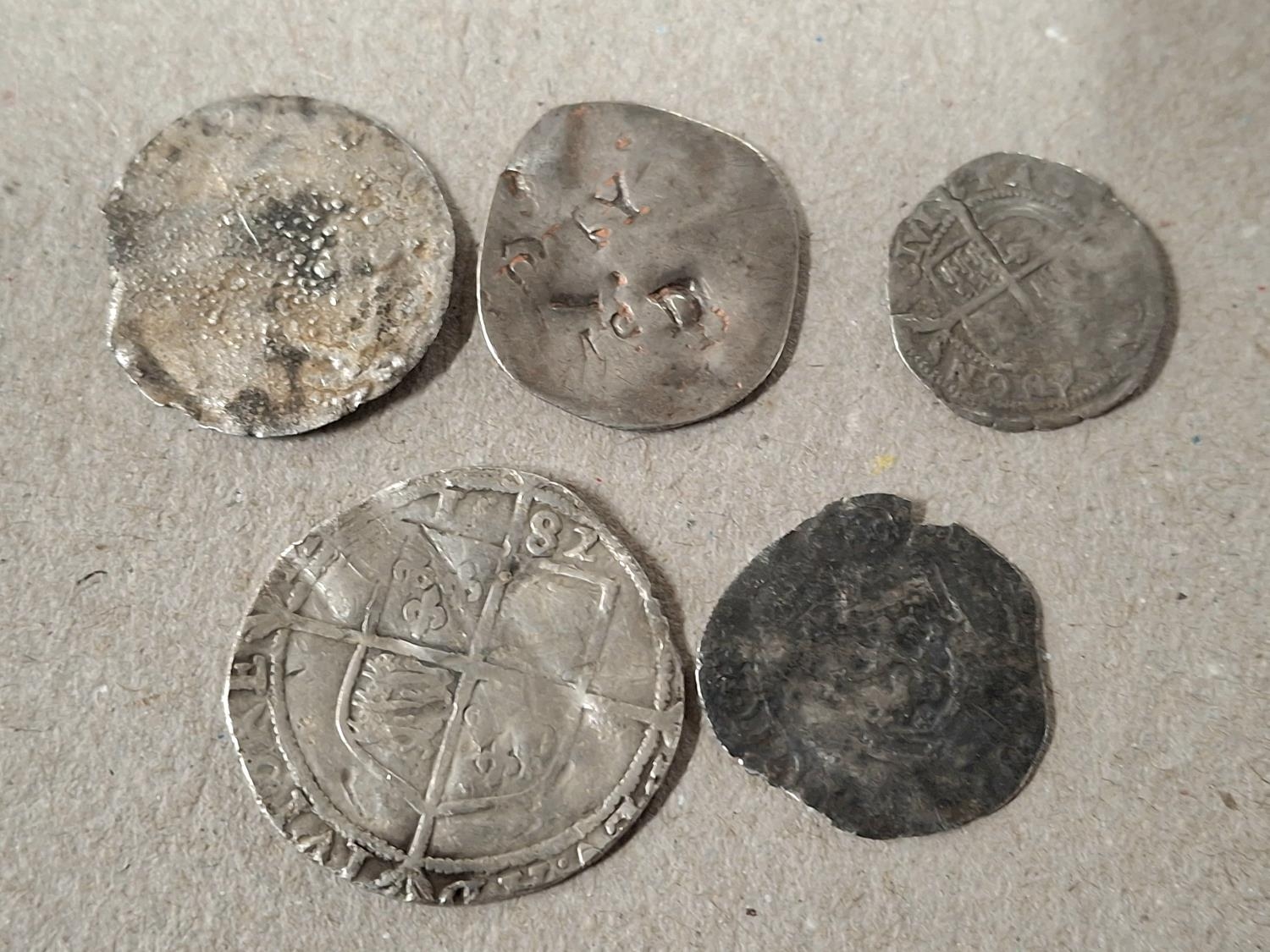 Clipped 1582 Elizabeth I silver sixpence together with four other well worn medieval hammered silver coinage (5)