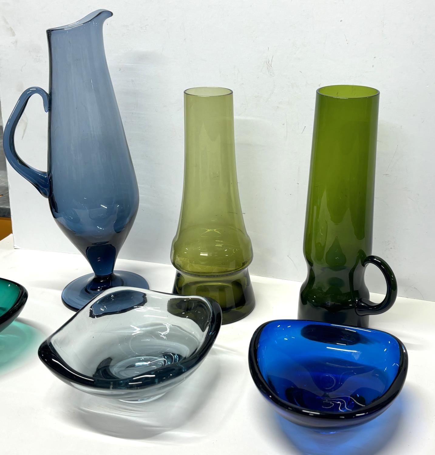 Three Scandinavian coloured glass jars together with 3 coloured glass bowls by Whitefriers (6)