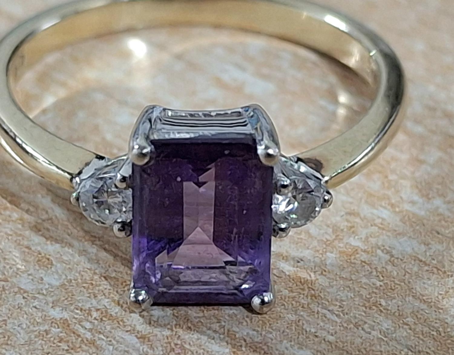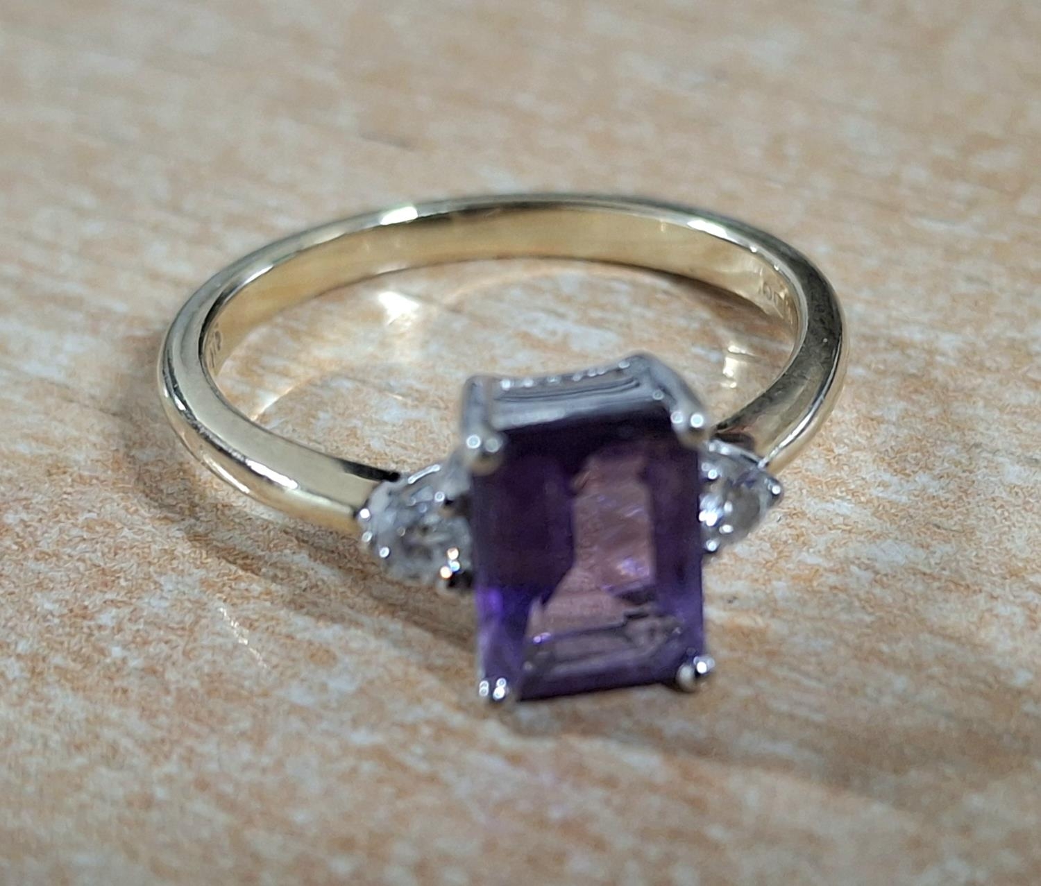9ct yellow gold ring with a large emerald cut Amethyst, flanked to either side by a small round cut diamond, 2.8 grams gross Size O