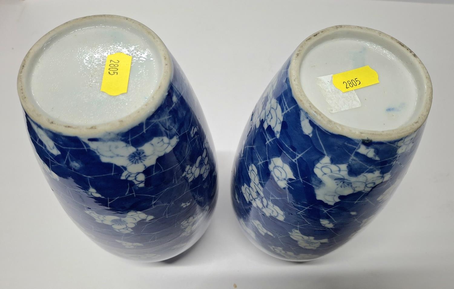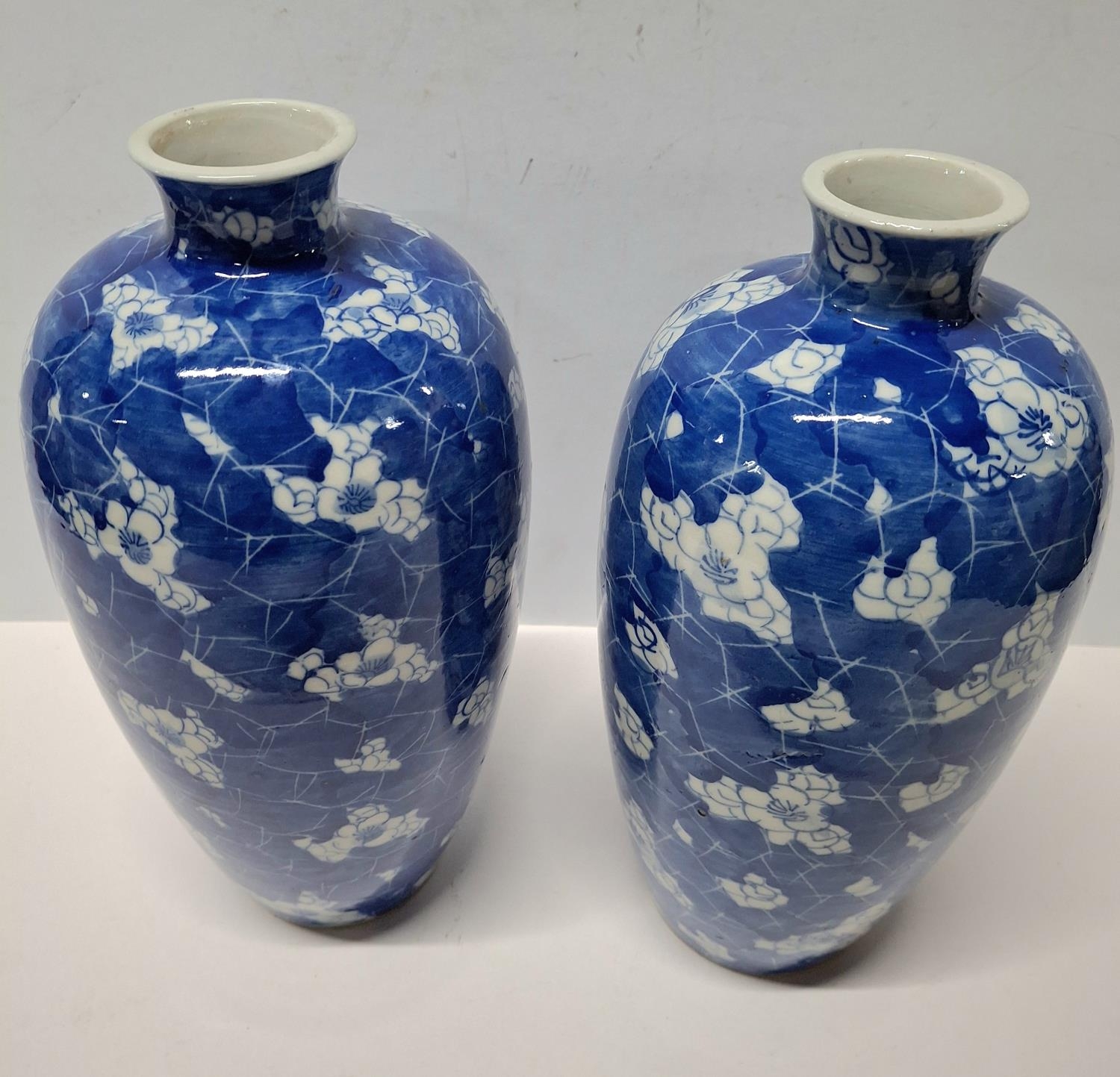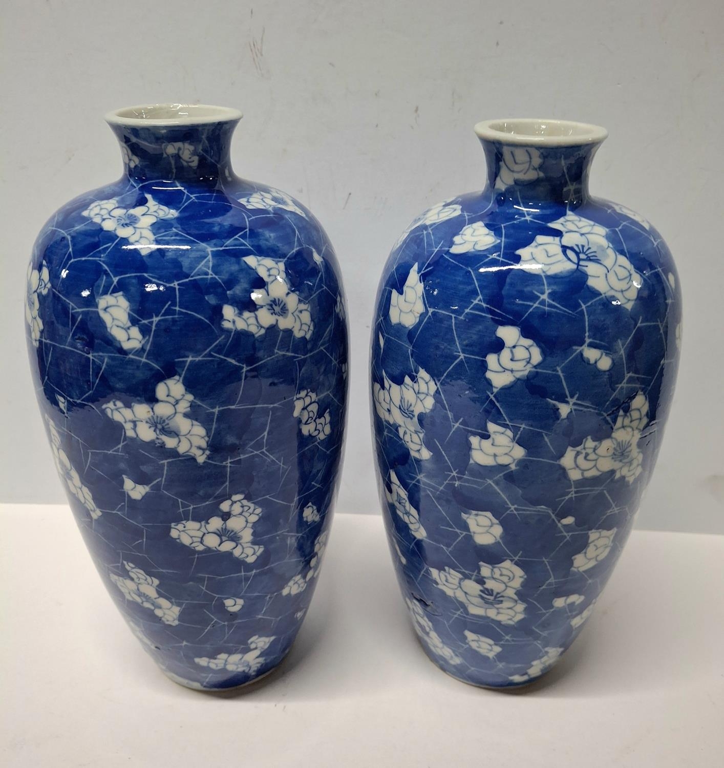 Pair of unmarked Chinese vases in blue & white with Prunus pattern (2), Both vases are approx 25cm tall