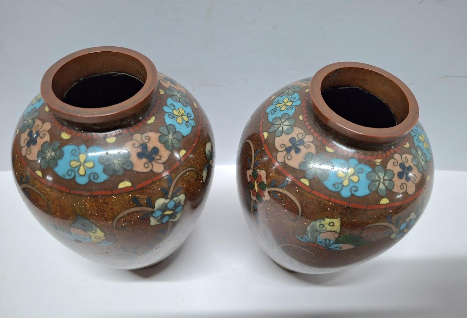 A pair of Japanese Meiji period rust ground cloisonné vases with scrolling branch & butterfly decoration (2), Both 12.5cm tall