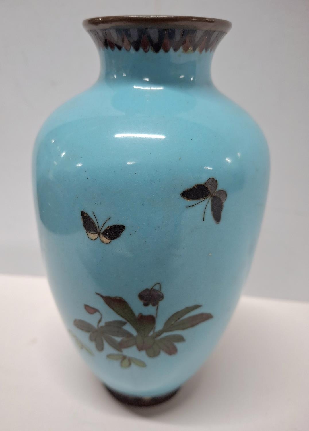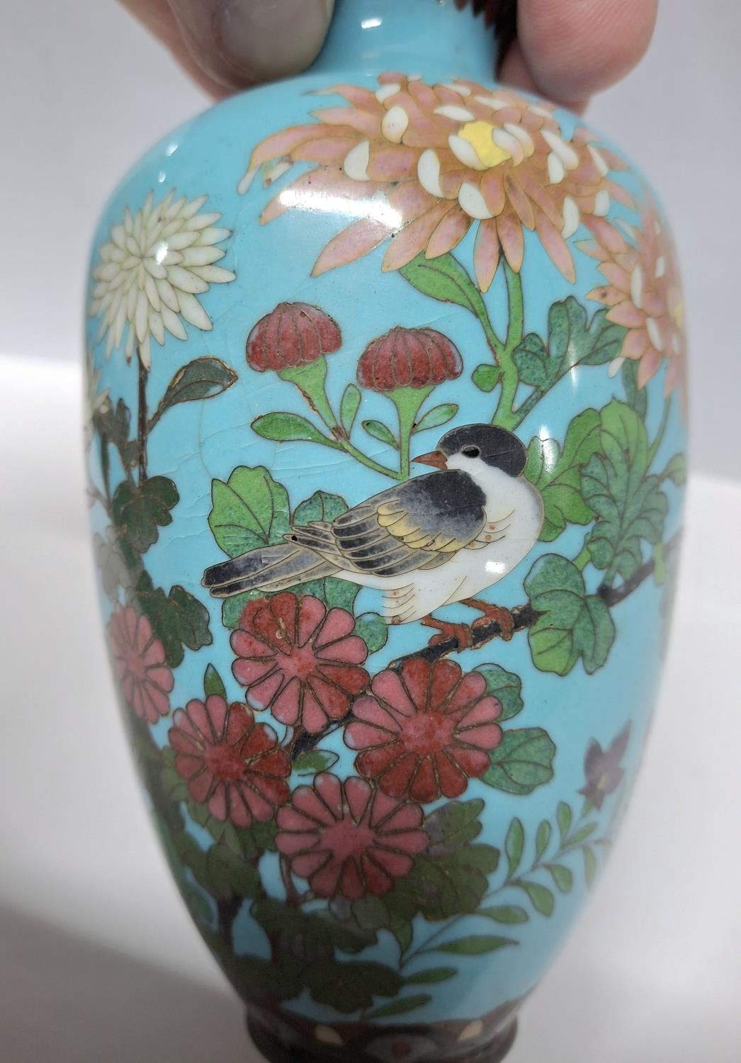 A Japanese Meiji period cloisonné vase blue ground with a bird on a flowering branch, 14.5cm tall