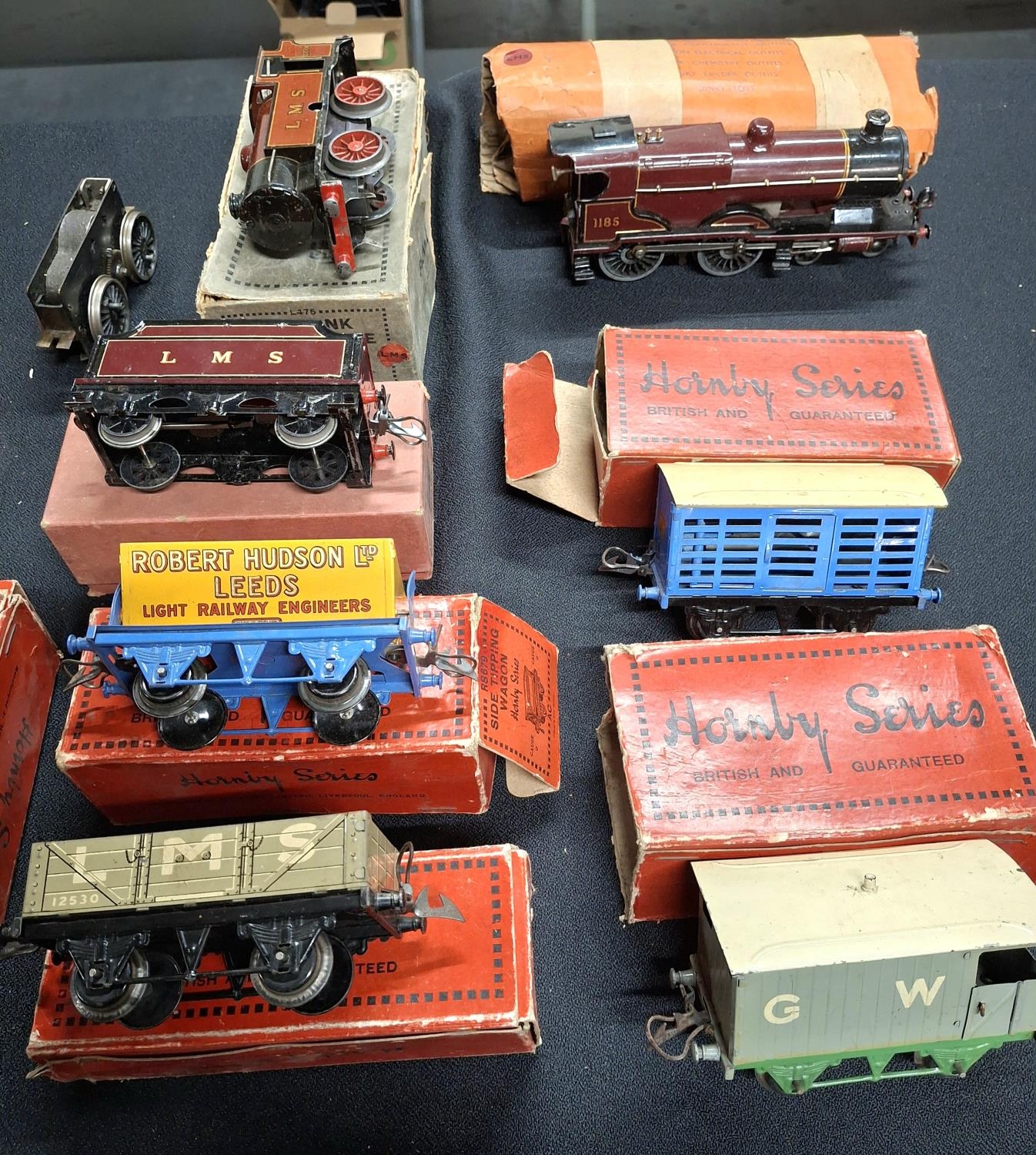 Large quantity of mid 20thC Hornby 0 gauge items including a complete track, M3 tank locomotive with original box, 2 no 2 saloon coaches in orignal boxes, various other boxed boxcars and other ancillery items, many in original boxes (Qty)