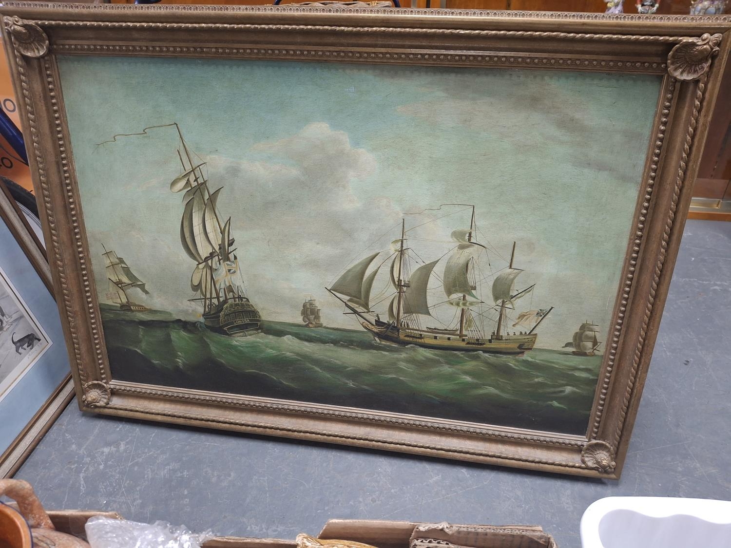 Large 20thC oil on canvas depicting 18thC warships in fine quality, ornate, modern frame, The oil measures 62 x 76 cm