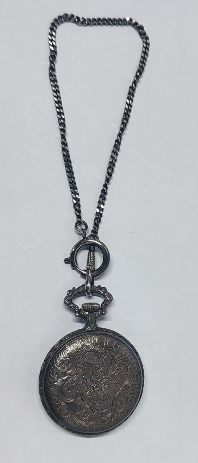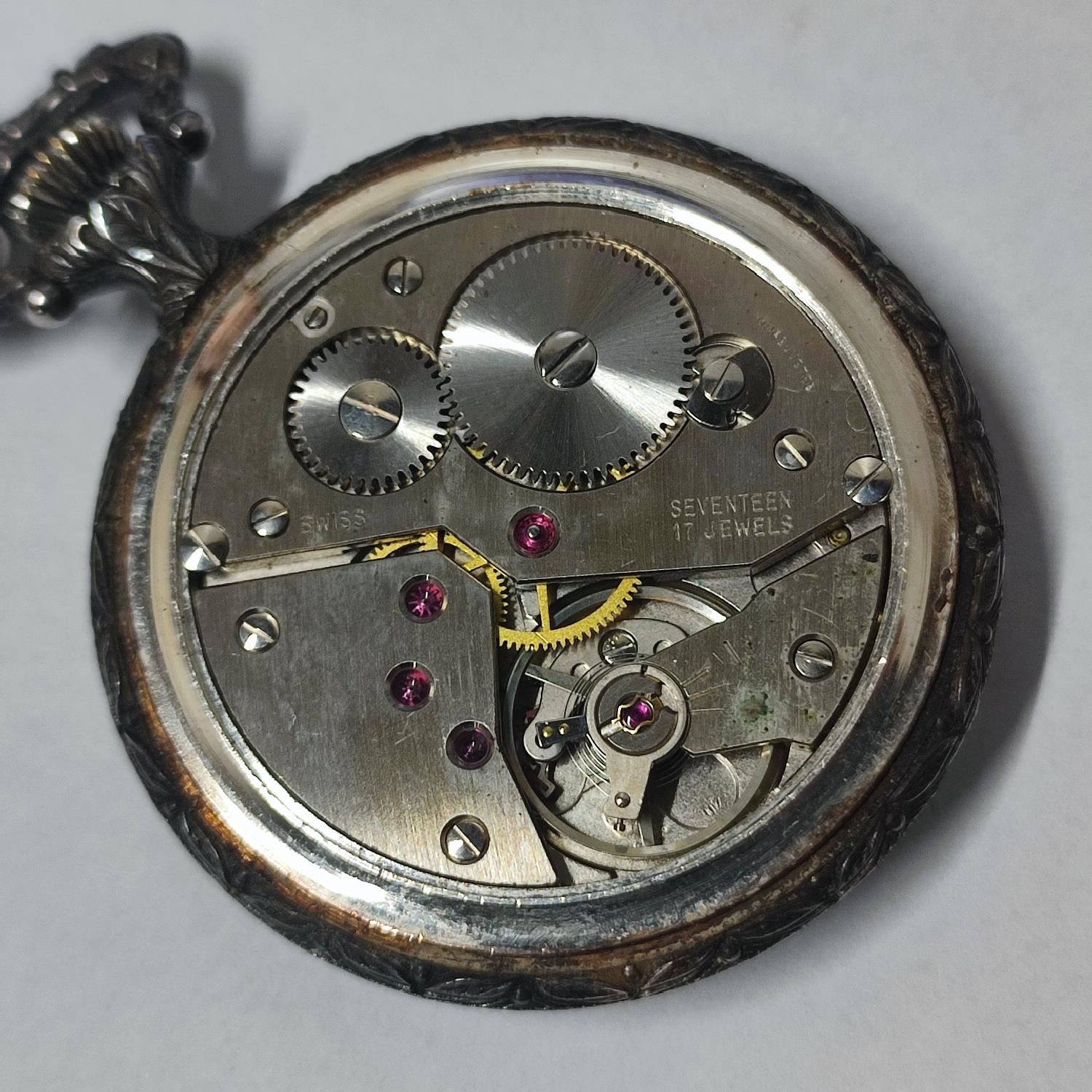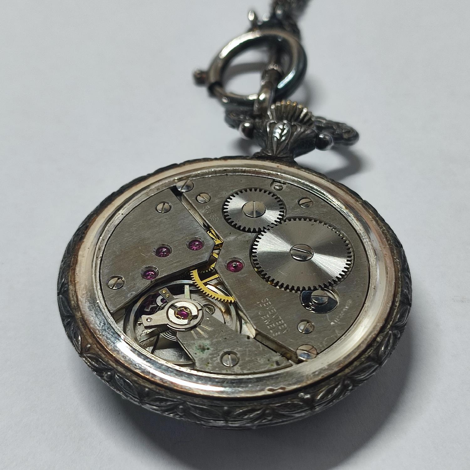 A beautiful “Royce” Incabloc, 17 Jewels, Swiss made, enamel face pocketwatch with metal chain, hunting scene depiction to the front and a floral engraved design to the back, manual winding