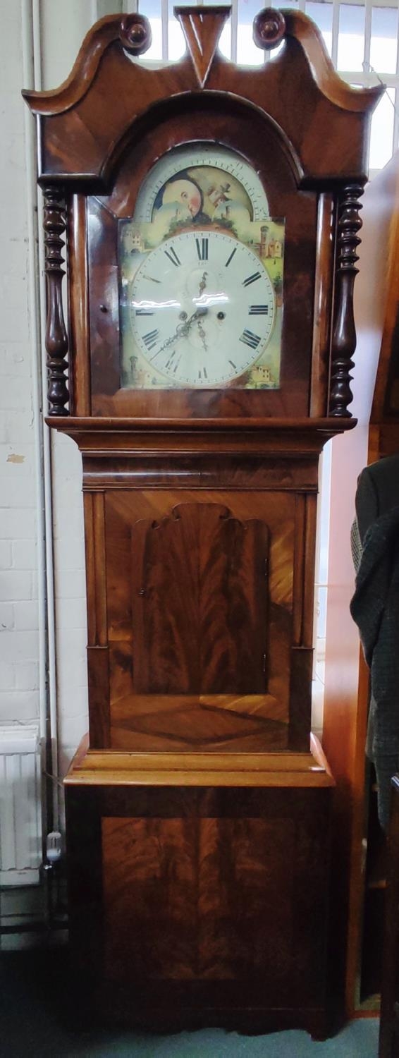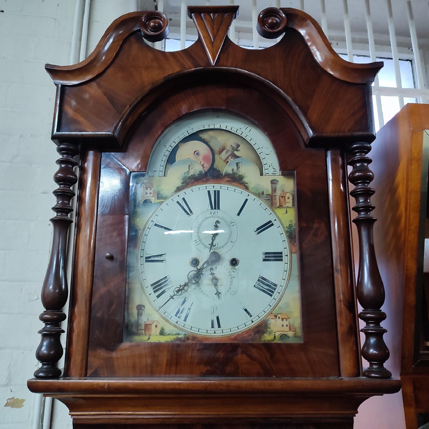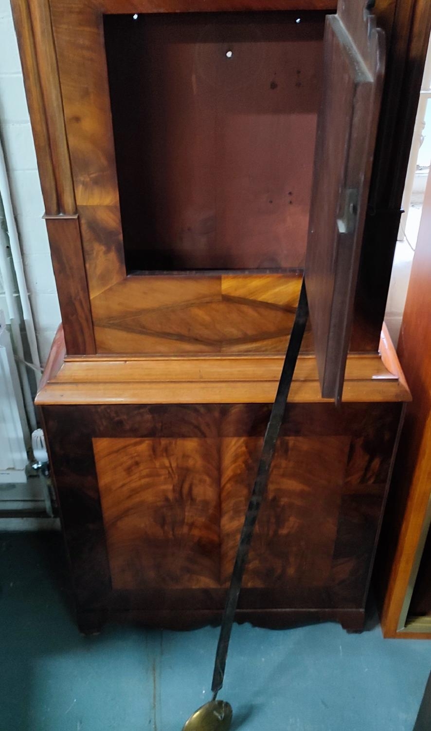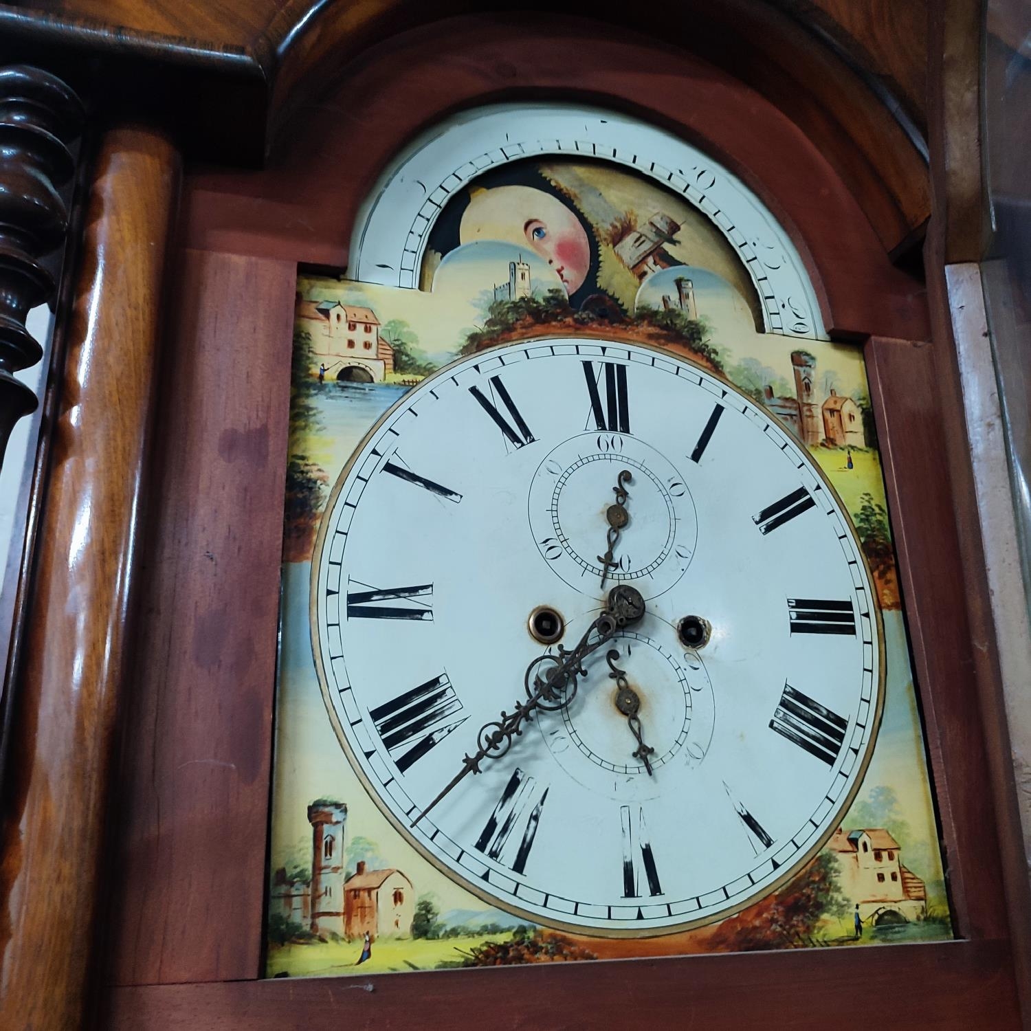 Tall antique long-case grandfather clock with hand-painted face, pendulum and key