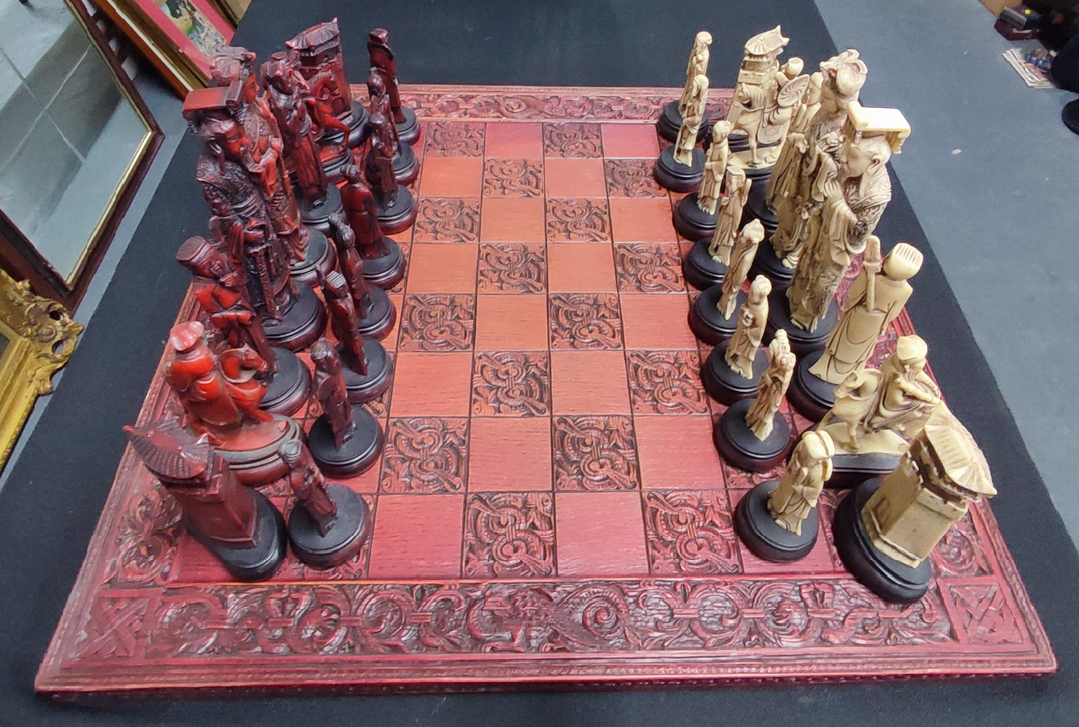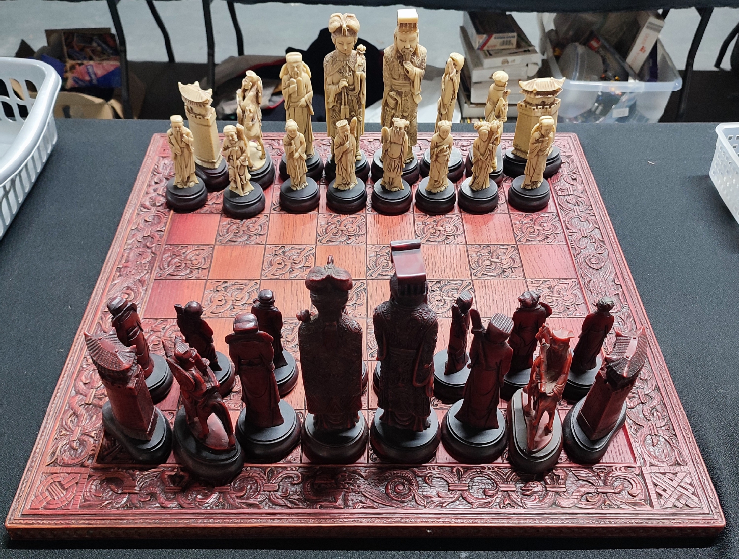 Chess set depicting characters from an oriental dynasty period, repair to one rook