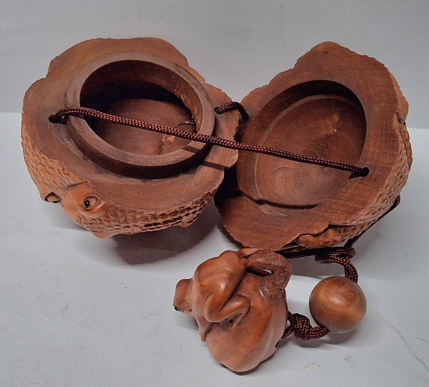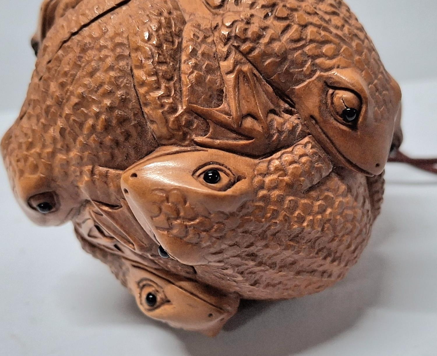 Netsuke Frog ball with tiny glass eyes together with a carved toggle of a Frog on an Acorn