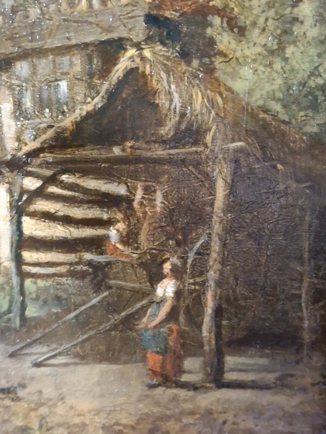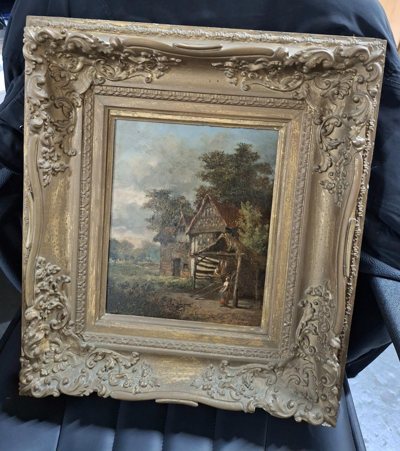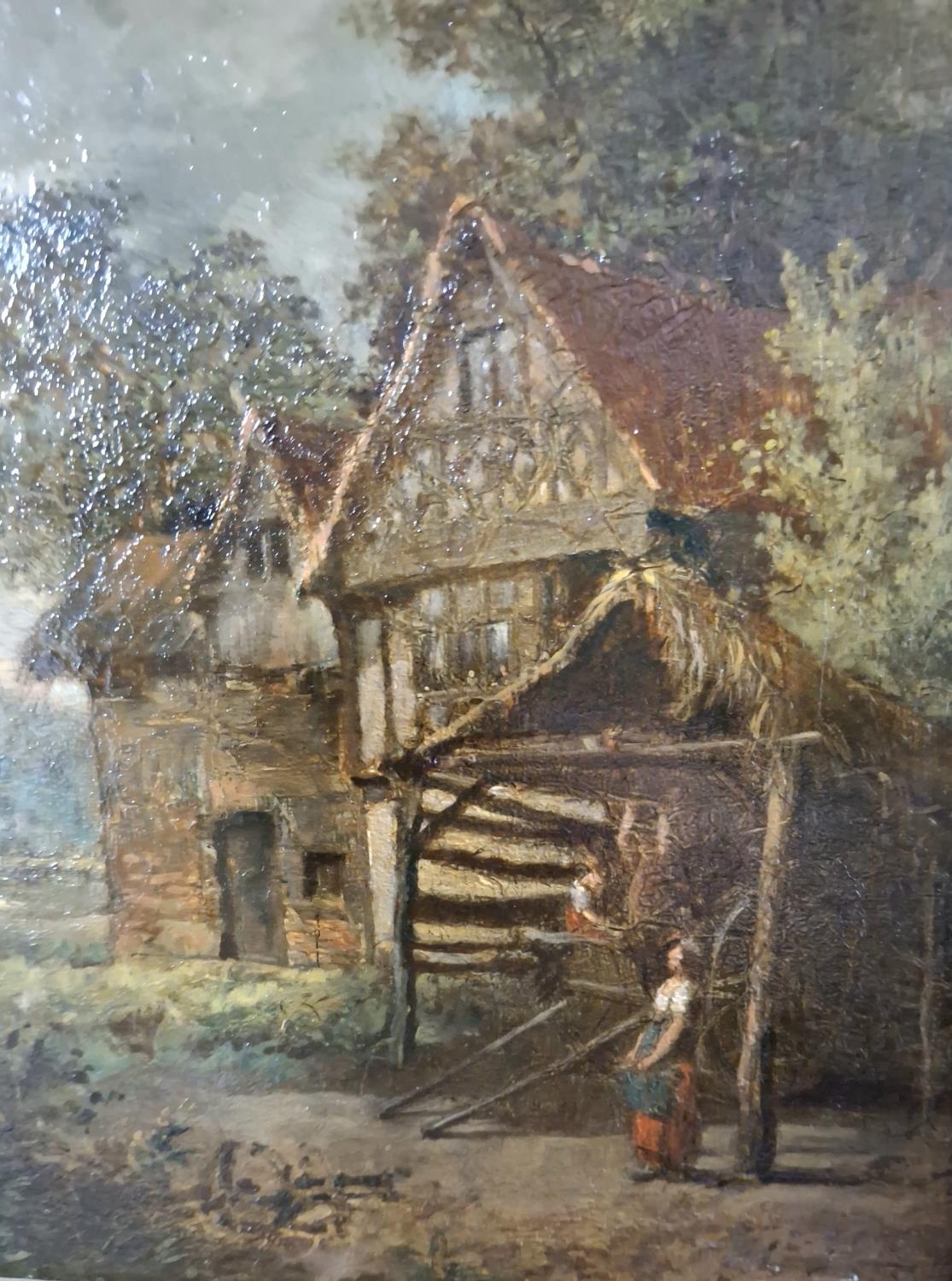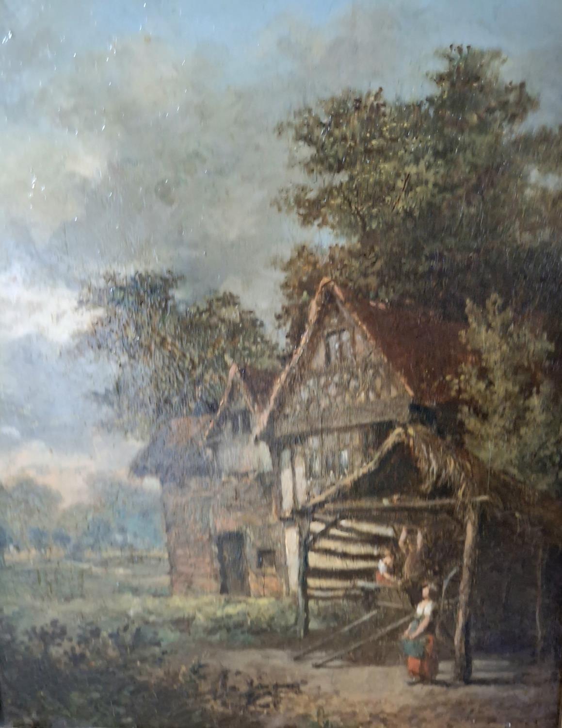 Mid/late 19thC oil on board, possibly indistinctly signed in the manner of John Constable depicting 2 peasant figures near a cart outside a large country cottage and which is housed in its original gilt frame,