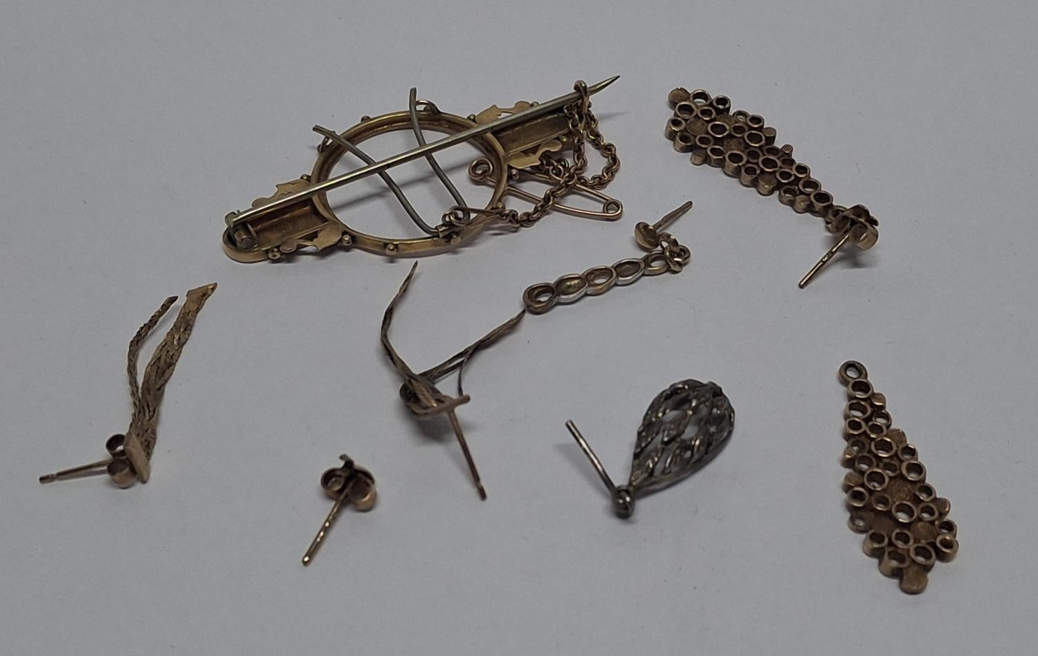 Collection of 9ct gold earrings and single earrings and a 9ct gold coin holding brooch (Qty), Please note – the brooch pin is not gold 11 grams gross