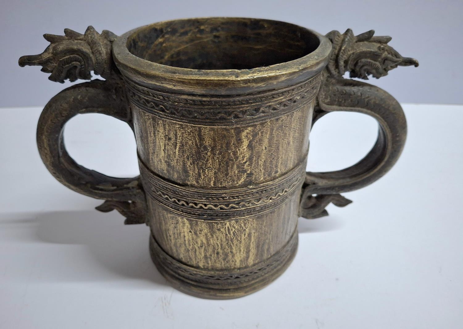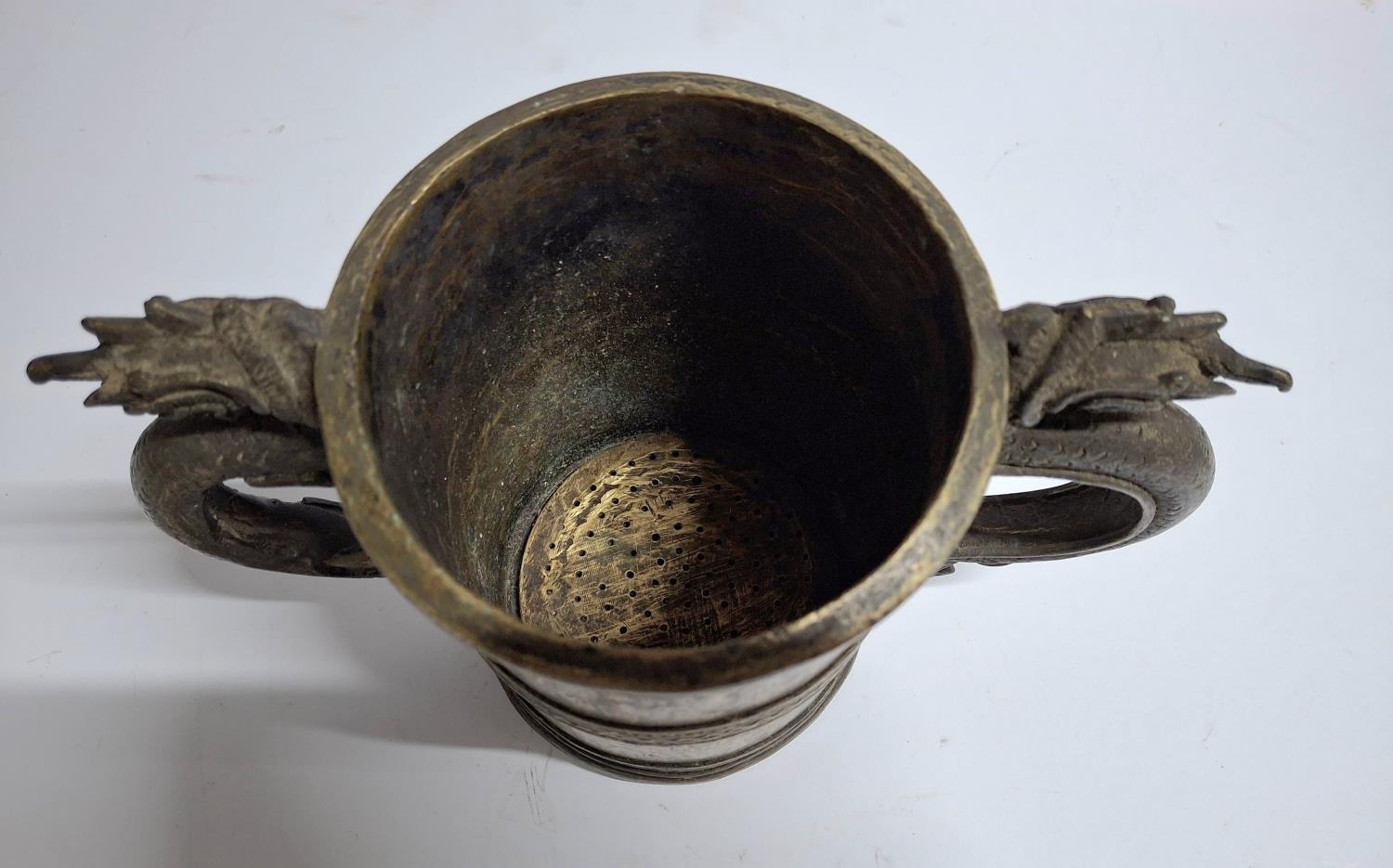 Unusual, heavy, antique Burmese brass two handled noodle/rice maker, Dragon decorated handles, Weighs 2.75 kgs 16cm tall