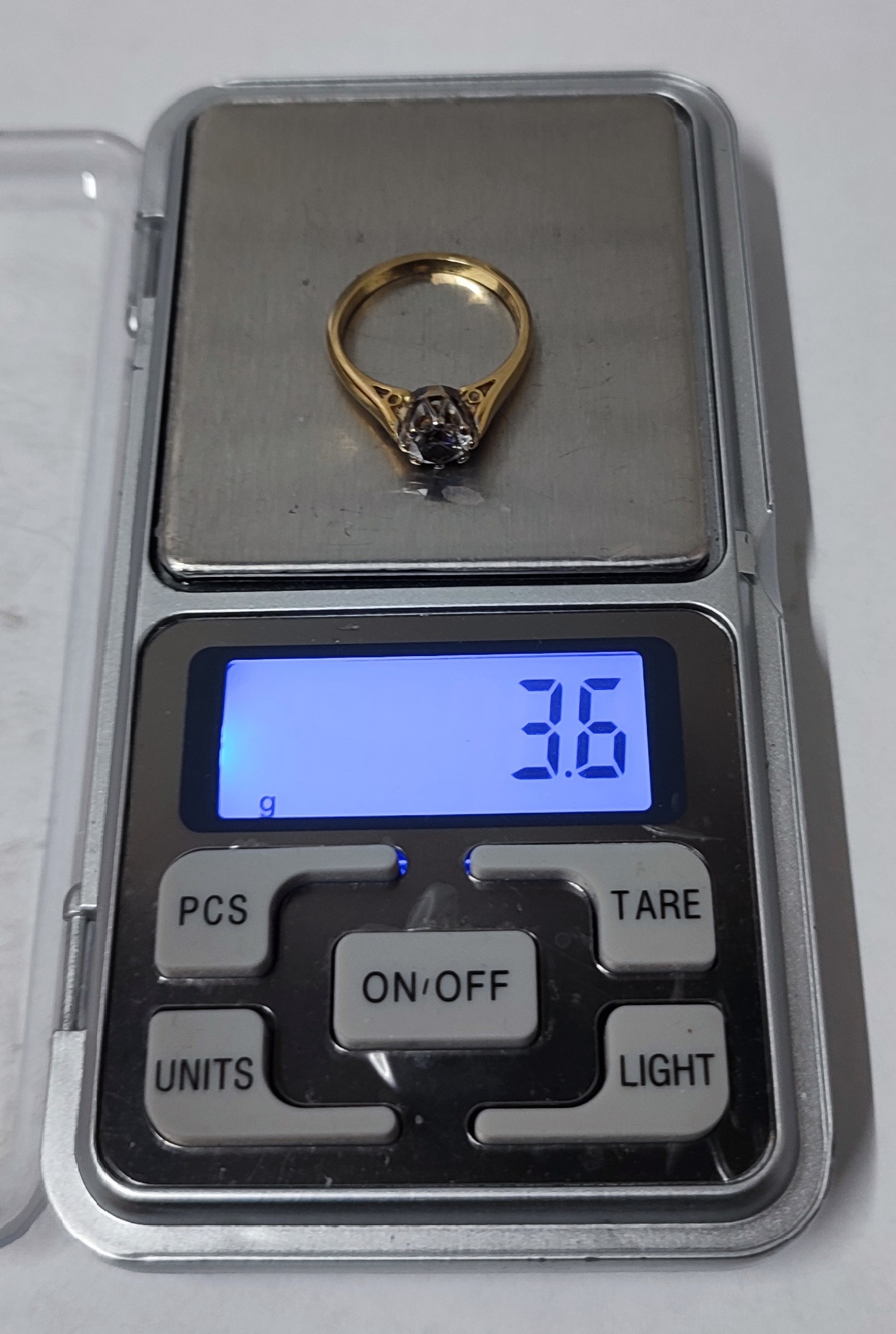 A traditional 18ct. Gold and Diamond solitaire ring, claw set, Gold shank with round brilliant cut Diamond approx. 1ct., 3.6 grams gross, size M/N