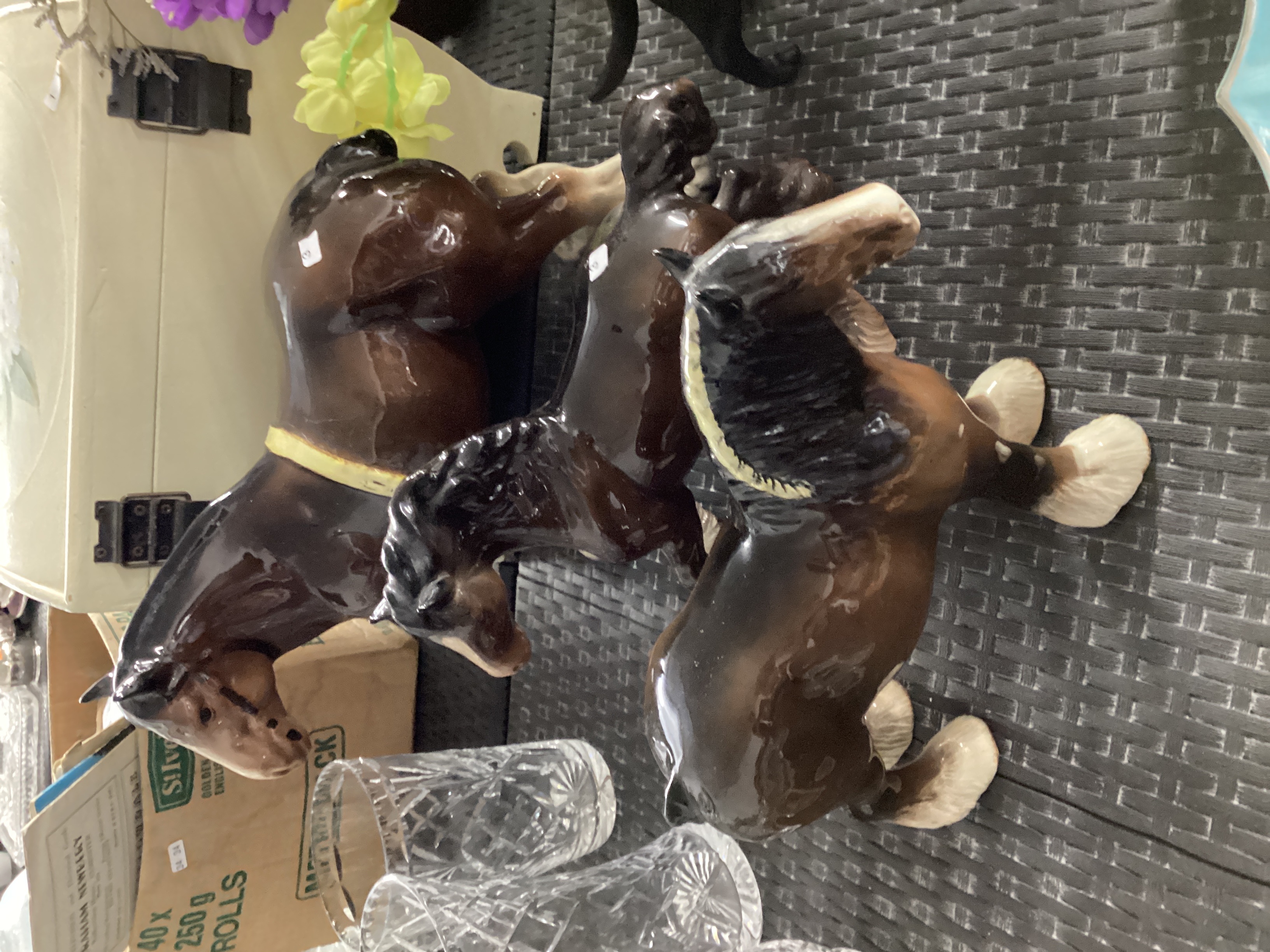 Three Beswick Shire horse figurines. Brown and dark brown glazed ceramic bodies with cream-colored feathered lower legs and hooves. The figurines have a high-gloss finish. Small white numerical stickers are present on the flanks. Numbers “1” and “3” are visible on two horses, while the third sticker on the largest horse is obscured.