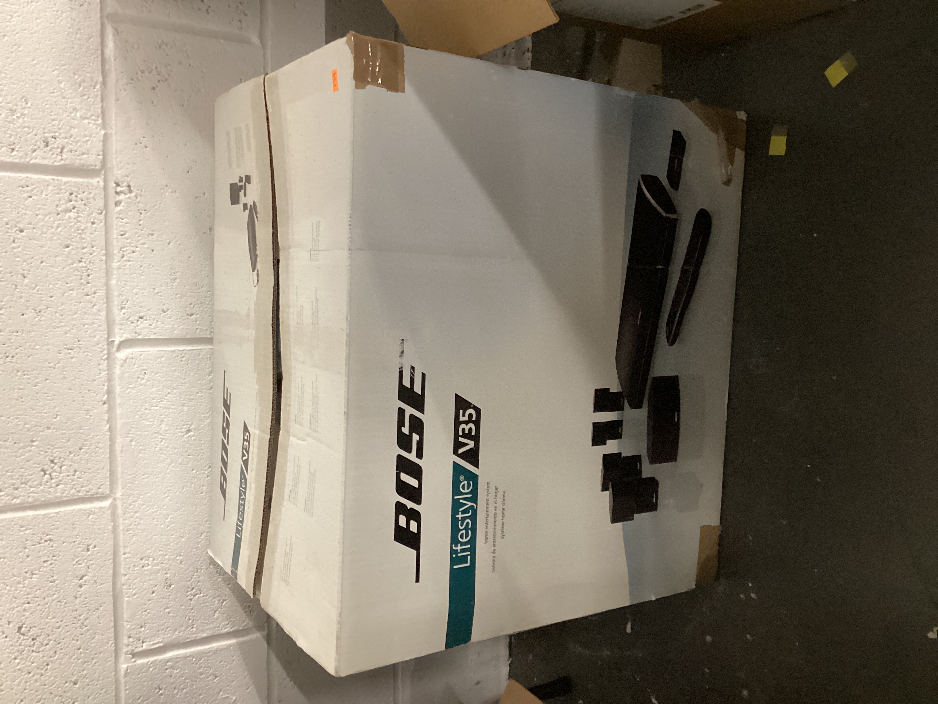 Bose Lifestyle V35 home entertainment system in original manufacturer’s box. The predominantly white box features teal and black branding, including the “BOSE” logo and “Lifestyle V35” model name. The box displays an illustration of the system components, including speakers, console, and remote. The box exhibits creasing, scuff marks, and brown packing tape applied to reinforce some edges. An orange sticker with illegible text is adhered to the upper right corner. The box appears sealed and intact.