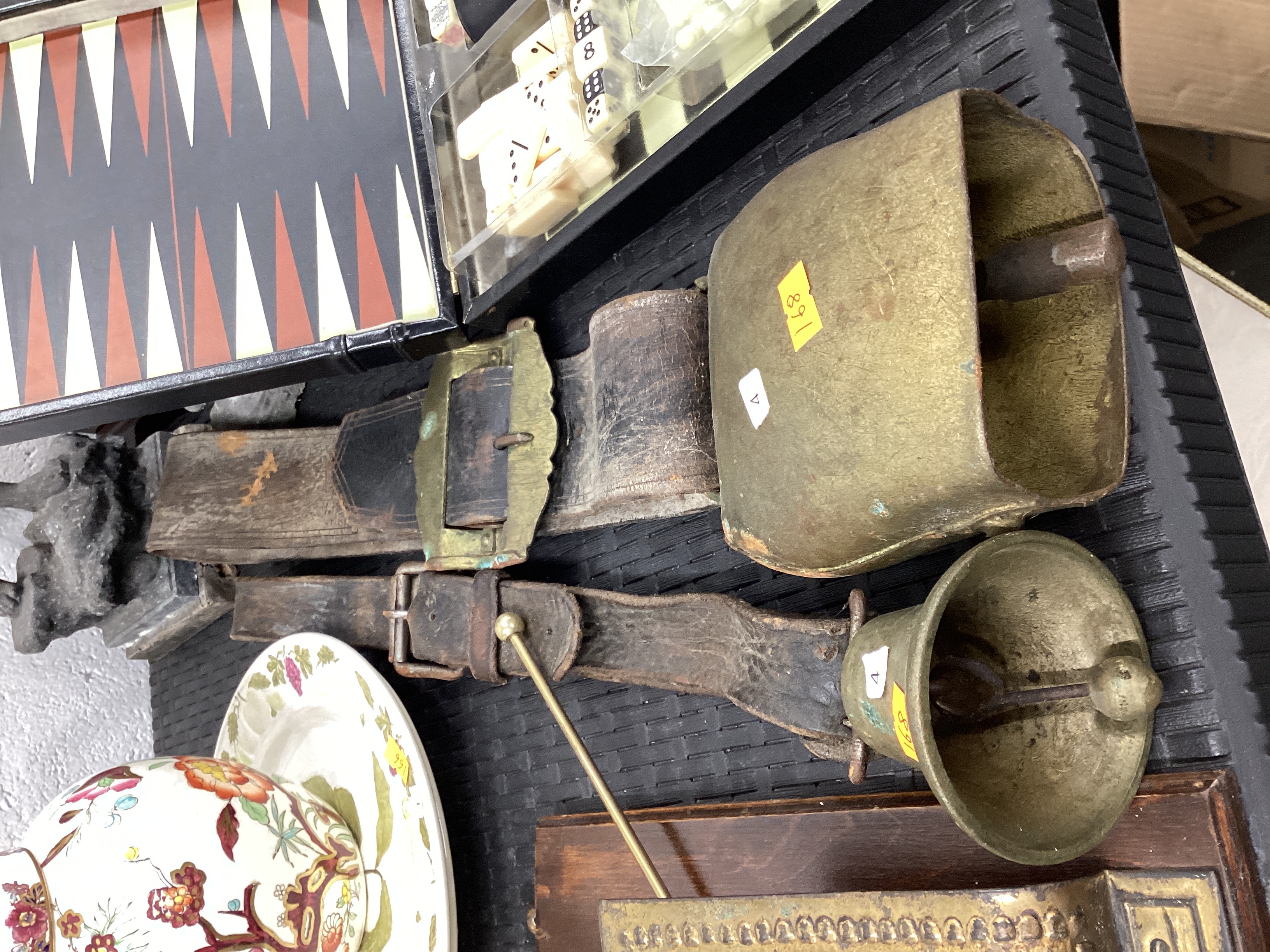 Two aged livestock bells, likely of brass or bronze construction, each fitted with a heavy, worn leather strap. The bells show significant patination, verdigris, and surface abrasions. One bell is conical, the other rectangular. Each bell has an internal clapper. The dark brown leather straps are stiff and creased with age and wear, and have tarnished metal buckles and fittings.