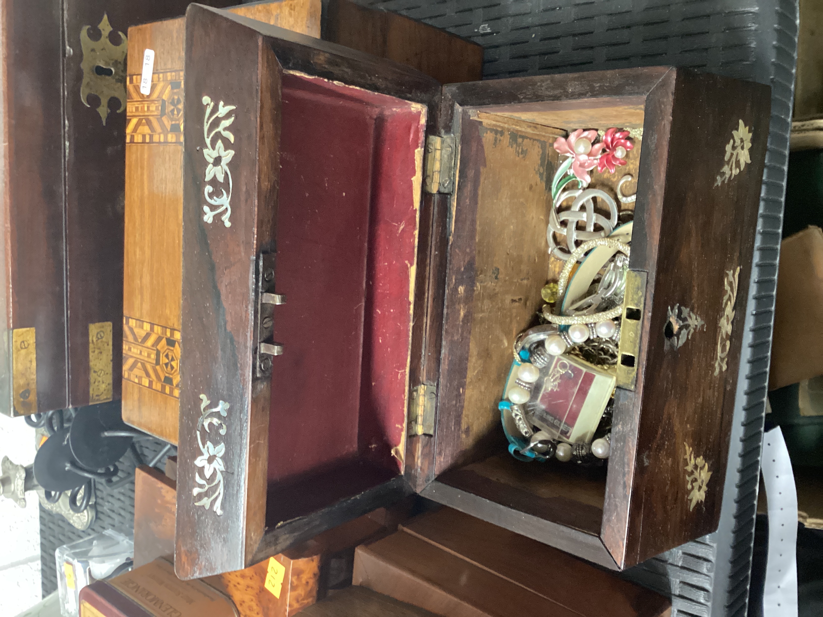 English wooden box, likely dating to the late 19th or early 20th century. The box is dark-stained, possibly rosewood or mahogany, and features delicate mother-of-pearl inlay depicting floral and foliate motifs on the lid and front. Brass or bronze-toned metal hardware includes external hinges, a front clasp, and an escutcheon. The interior is lined with worn, faded red fabric, likely velvet. The box exhibits surface wear, scuffs, scratches to the wood, some chipping along edges, tarnish to the metal, and fraying to the interior lining.