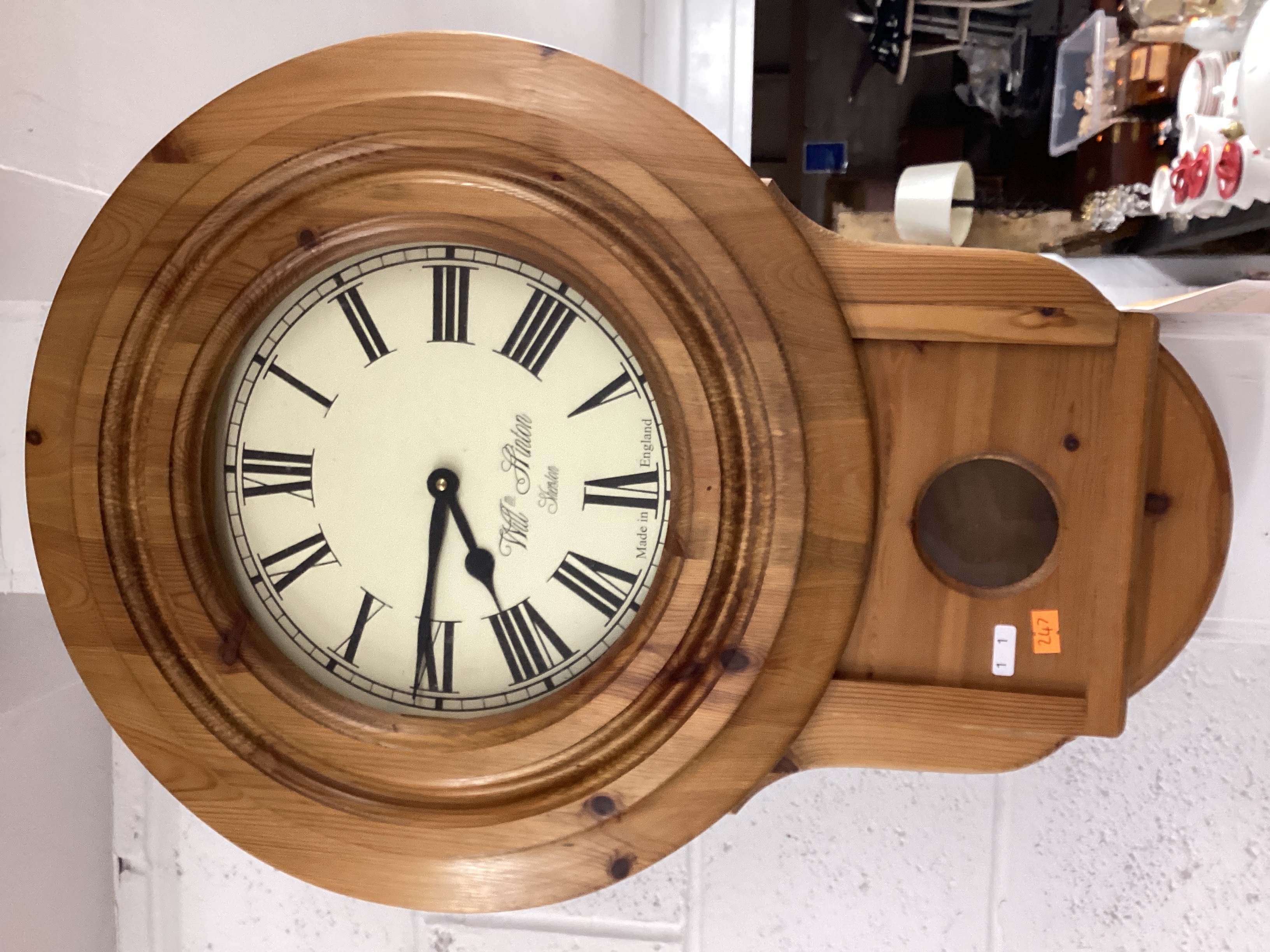 Will Hinton Shepton Made in England pine drop dial wall clock. The circular upper section encloses a cream-colored dial with black Roman numerals and hands. The rectangular lower section has a central circular aperture. Two adhesive labels with the numbers “1 1” and “247” are affixed to the lower portion of the case. The clock shows general light wear consistent with display and handling.