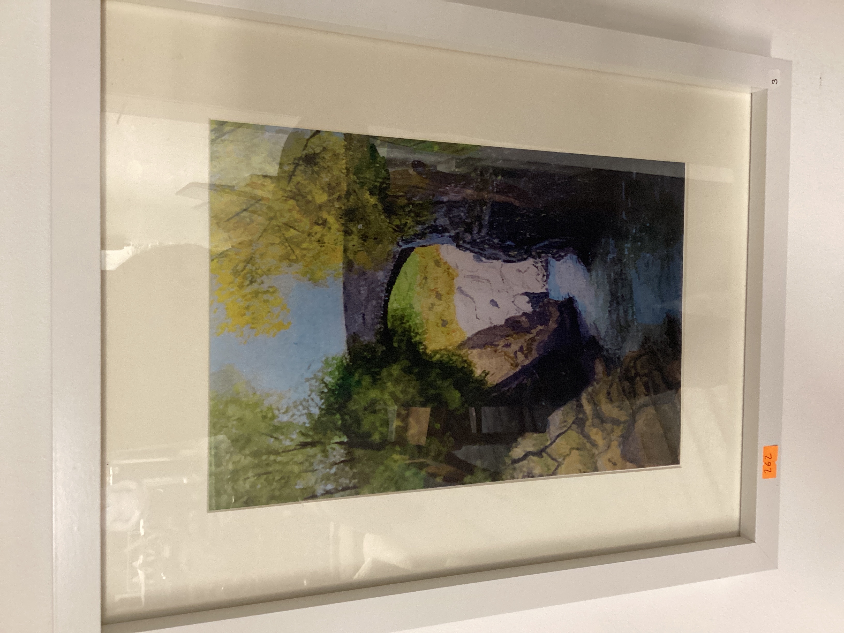 Framed landscape artwork depicting a stone arch bridge over a stream in a rocky gorge. The artwork is presented under glazing and a cream-colored mat within a simple, light-colored frame. The foliage depicted includes green and yellow trees. An orange sticker with the number “262” is affixed to the lower left of the frame, and a small, dark number “3” is present on the lower right corner.