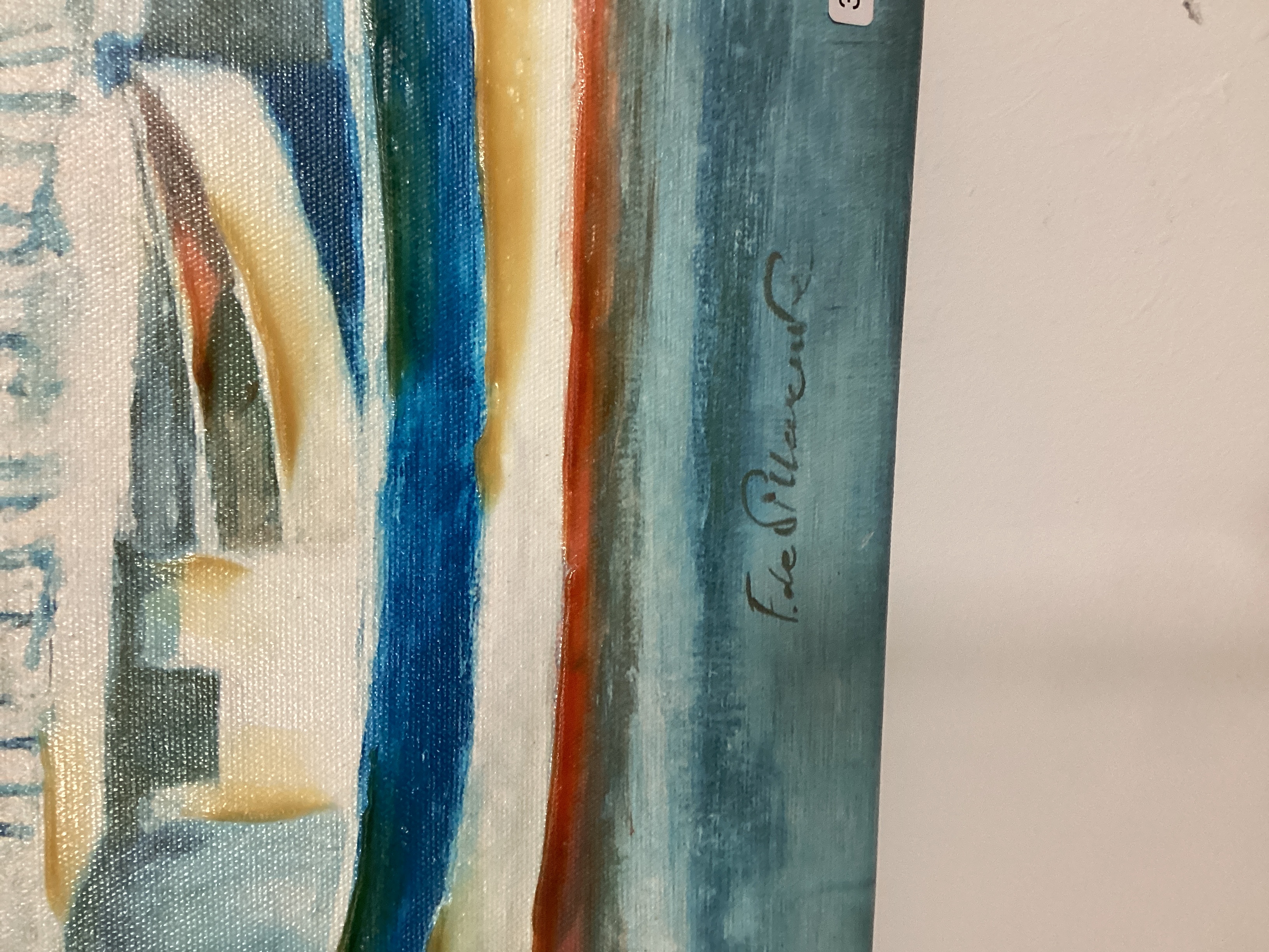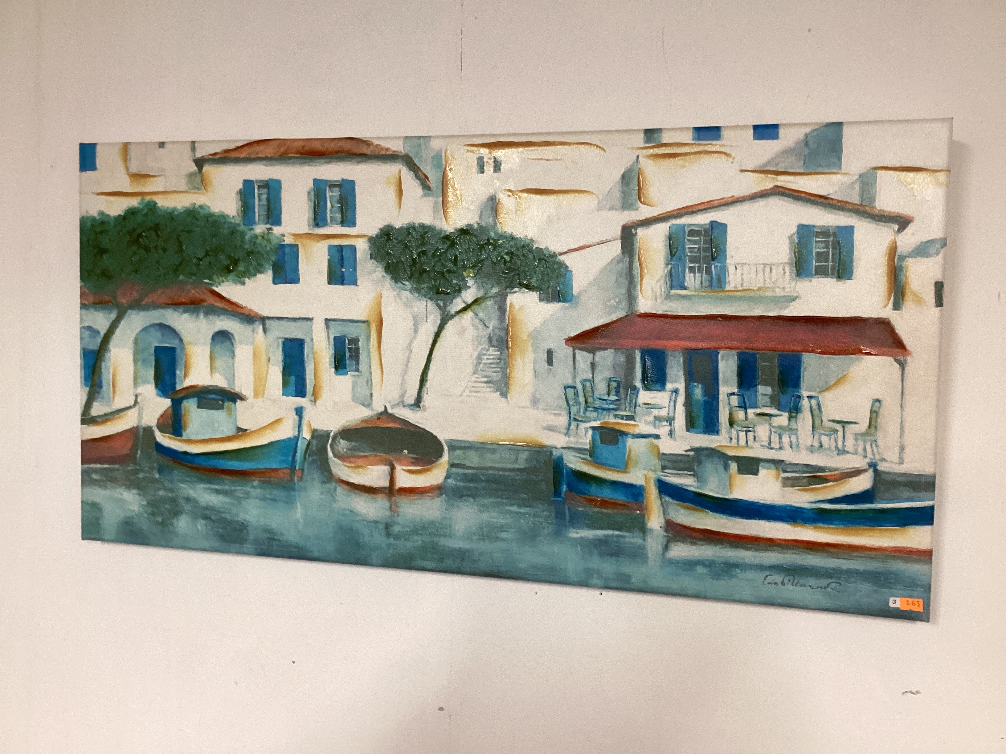 Oil on canvas painting depicting a Mediterranean-style waterside village scene. The composition features white stucco buildings with blue shutters and red roofs, moored boats, and trees. The artwork is executed in a colorful, impasto style with visible brushstrokes and selective gold highlights on the architecture. A signature, possibly reading “Edu Pillavert,” is present in the lower right corner. A small white sticker marked “3” and an orange sticker are also present in the lower right corner. The canvas is taut, and the painting appears to be in good overall condition.