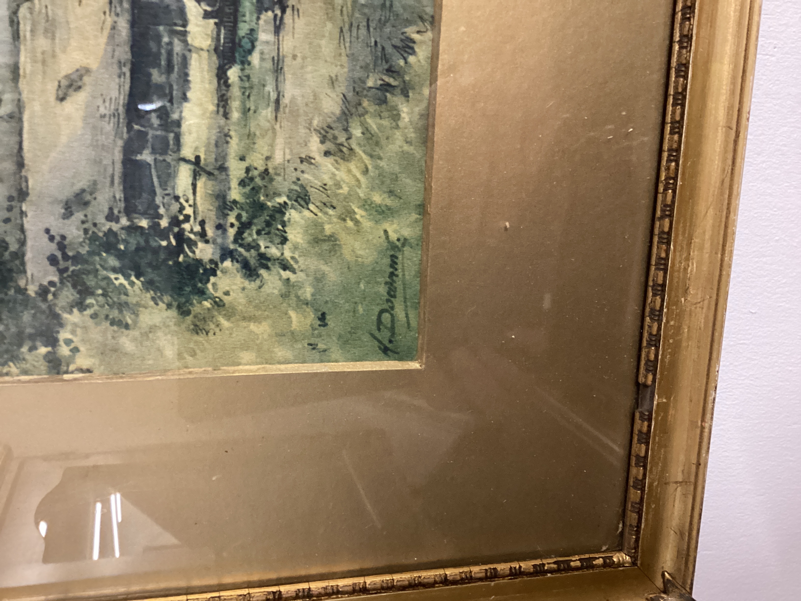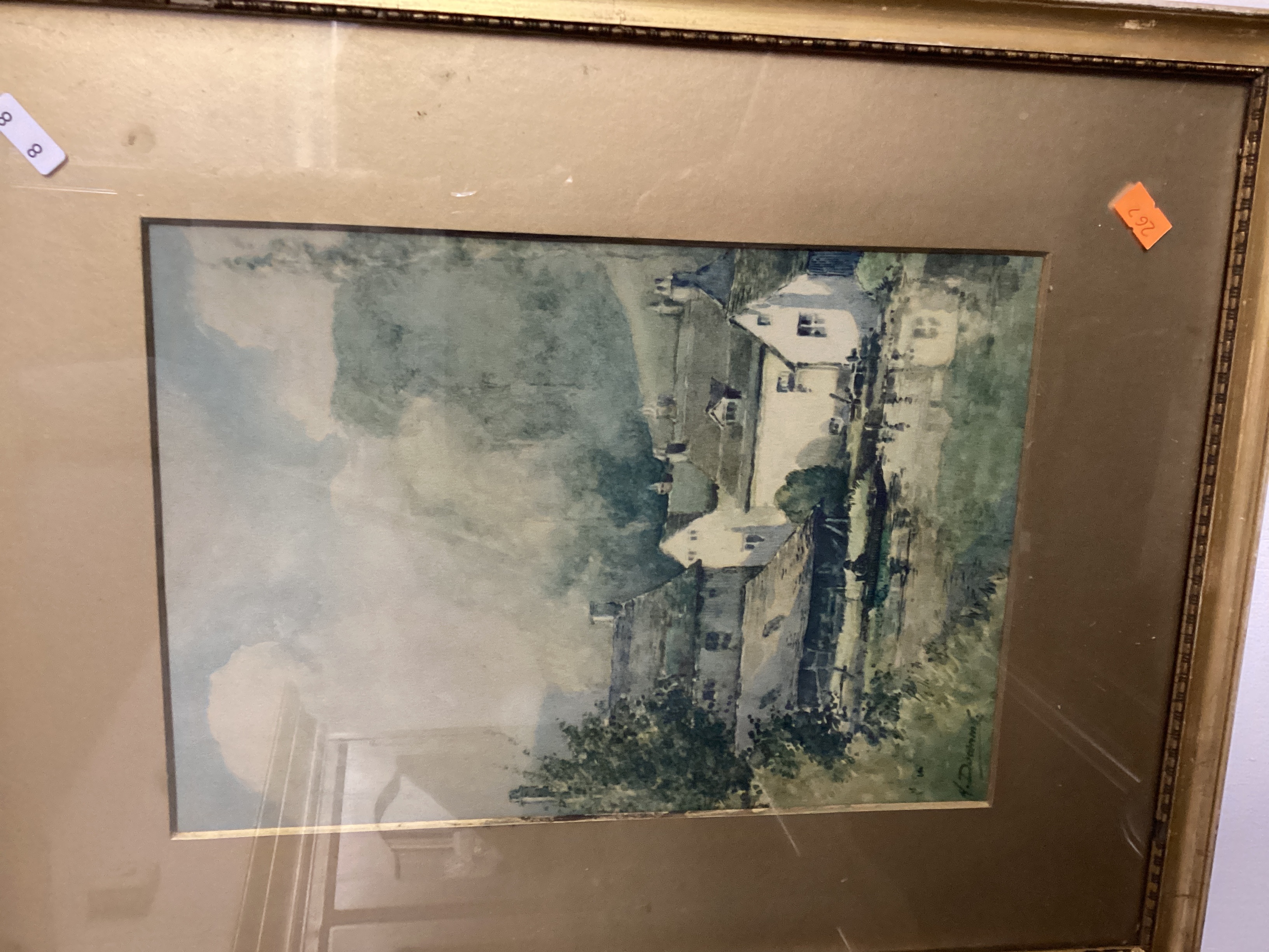 Framed watercolor painting on paper depicting a landscape scene with buildings near a body of water and distant hills. Signed “H. Doownm” in the lower left corner. Housed under glass with a wide, light-colored mat within a giltwood frame. The frame is marked “88” in the top right and has an orange sticker with “207” on the bottom right.