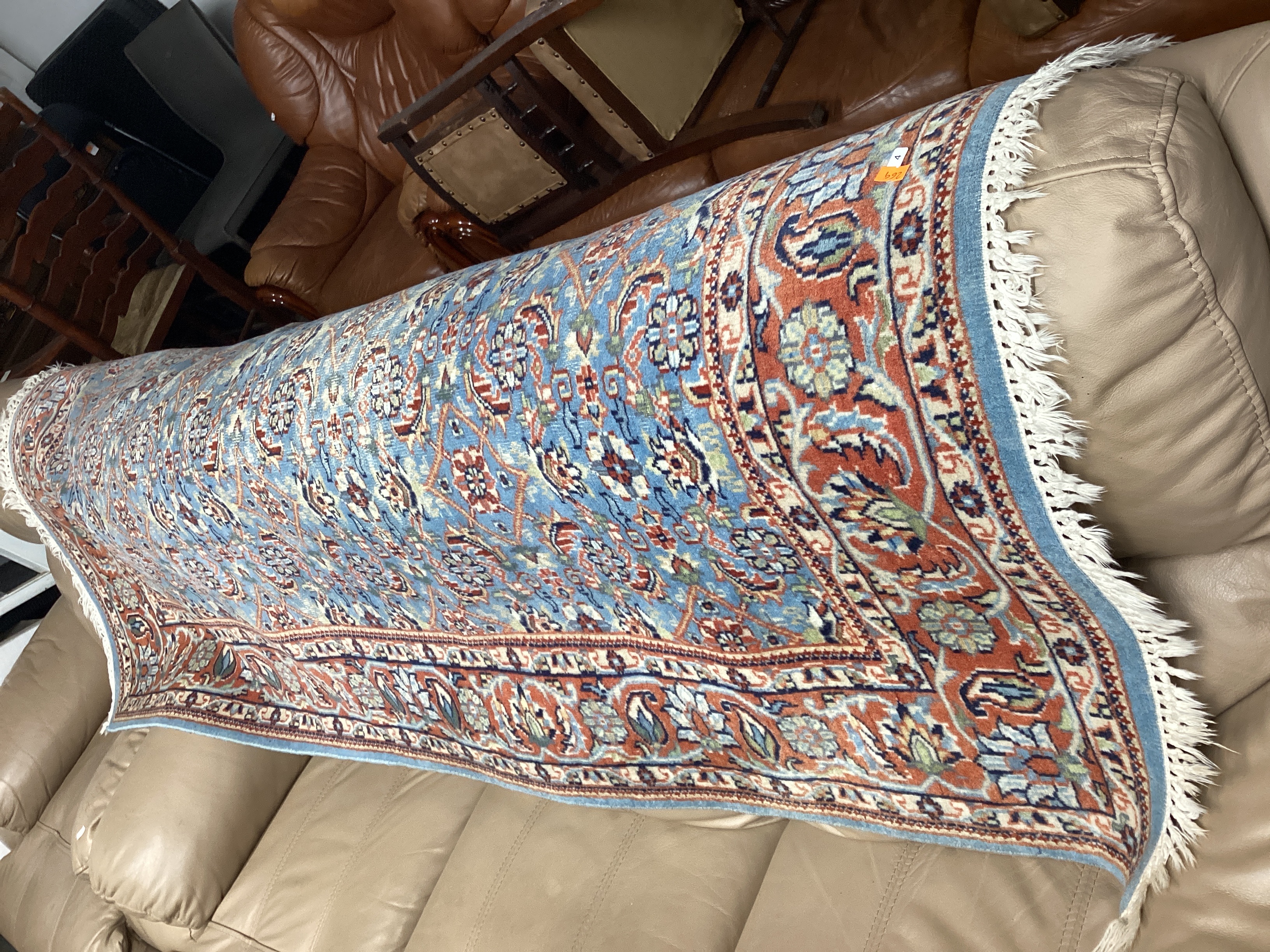 Hand-knotted Oriental-style rug featuring a light blue field with an all-over floral and geometric design, centered by a large medallion. The rug is framed by multiple borders in shades of red, cream, and brown. It is finished with white cotton fringes. The rug is partially rolled and appears to be constructed with a wool pile. An orange inventory tag marked ‘269’ and ‘4’ is attached.