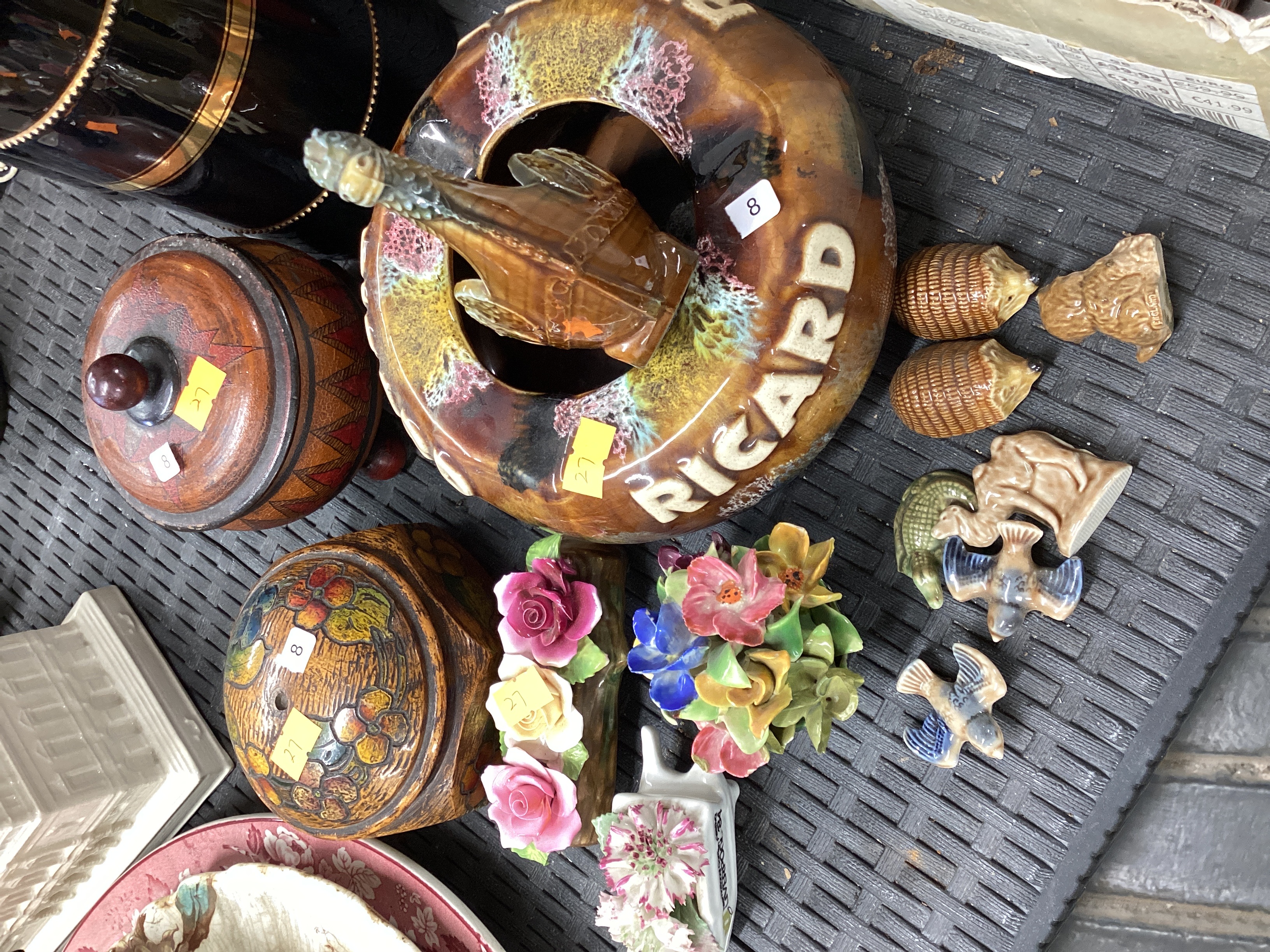 This lot features a vintage ceramic Vinicola Boccaccio Ricard decanter/ashtray, shaped like a lifebuoy and featuring a duck figurine. The lot also includes two lidded boxes – one ornate wooden box with a colorful floral design, and another geometric patterned box. Additional items include a white ceramic architectural model, a pink floral transferware plate, a porcelain floral arrangement marked “LIVERPOOL ’84”, and various miniature animal figurines (birds, a crocodile, and hedgehog-like forms). Most items appear to be in good, used condition with some wear. Several items bear yellow “27” and white “8” stickers.