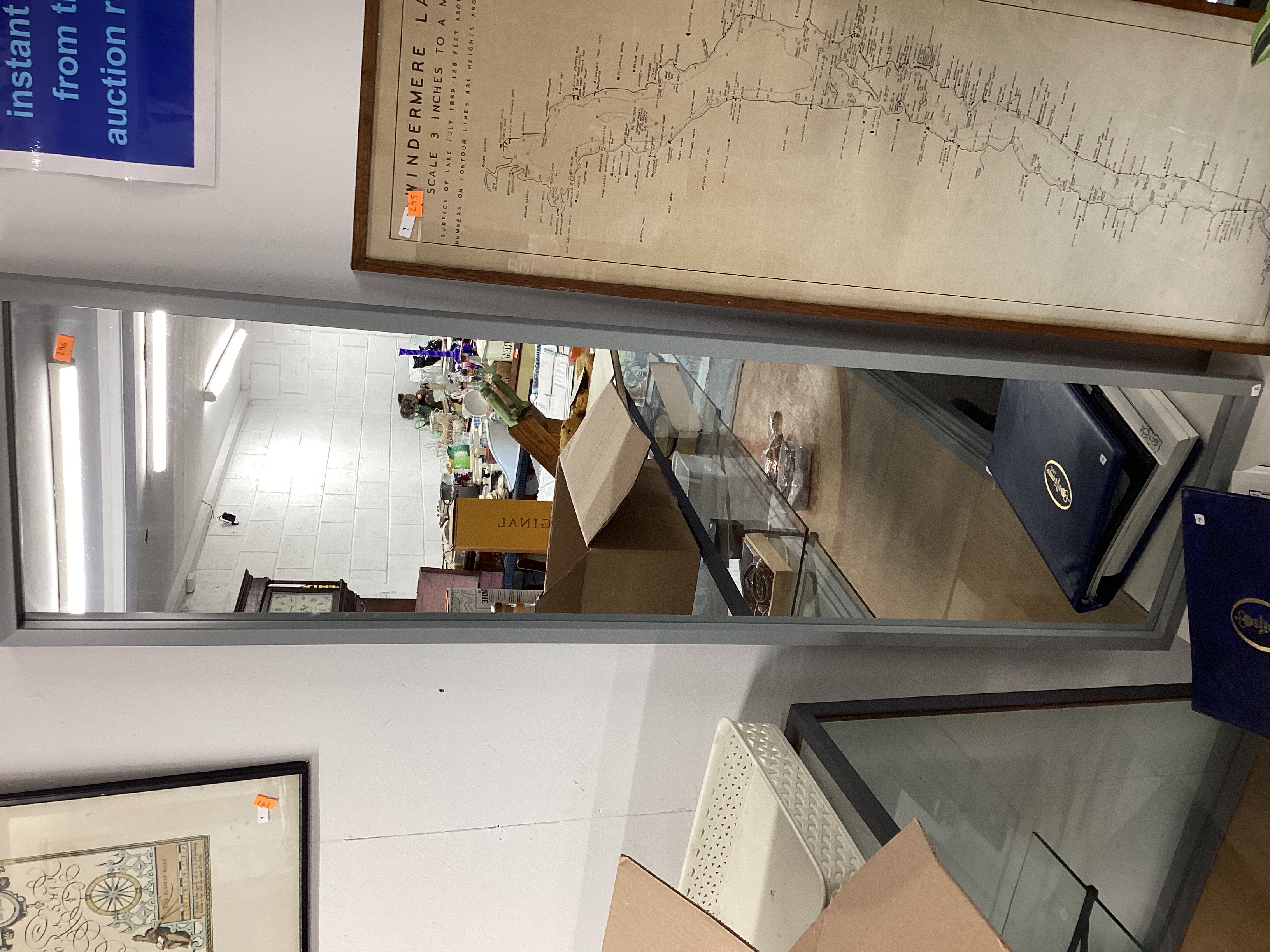 Modern grey metal and glass display cabinet. The cabinet appears to be in generally good used condition, with the glass panels intact and the frame showing minor superficial wear consistent with age and handling. An orange auction sticker numbered “296” is adhered to the top right of the frame. Inside the cabinet, a yellow box with the reversed text “JANJO” is visible, along with several dark blue binders, one featuring a gold oval emblem that includes the partially visible text “The Institute of WA…” and a small white sticker.