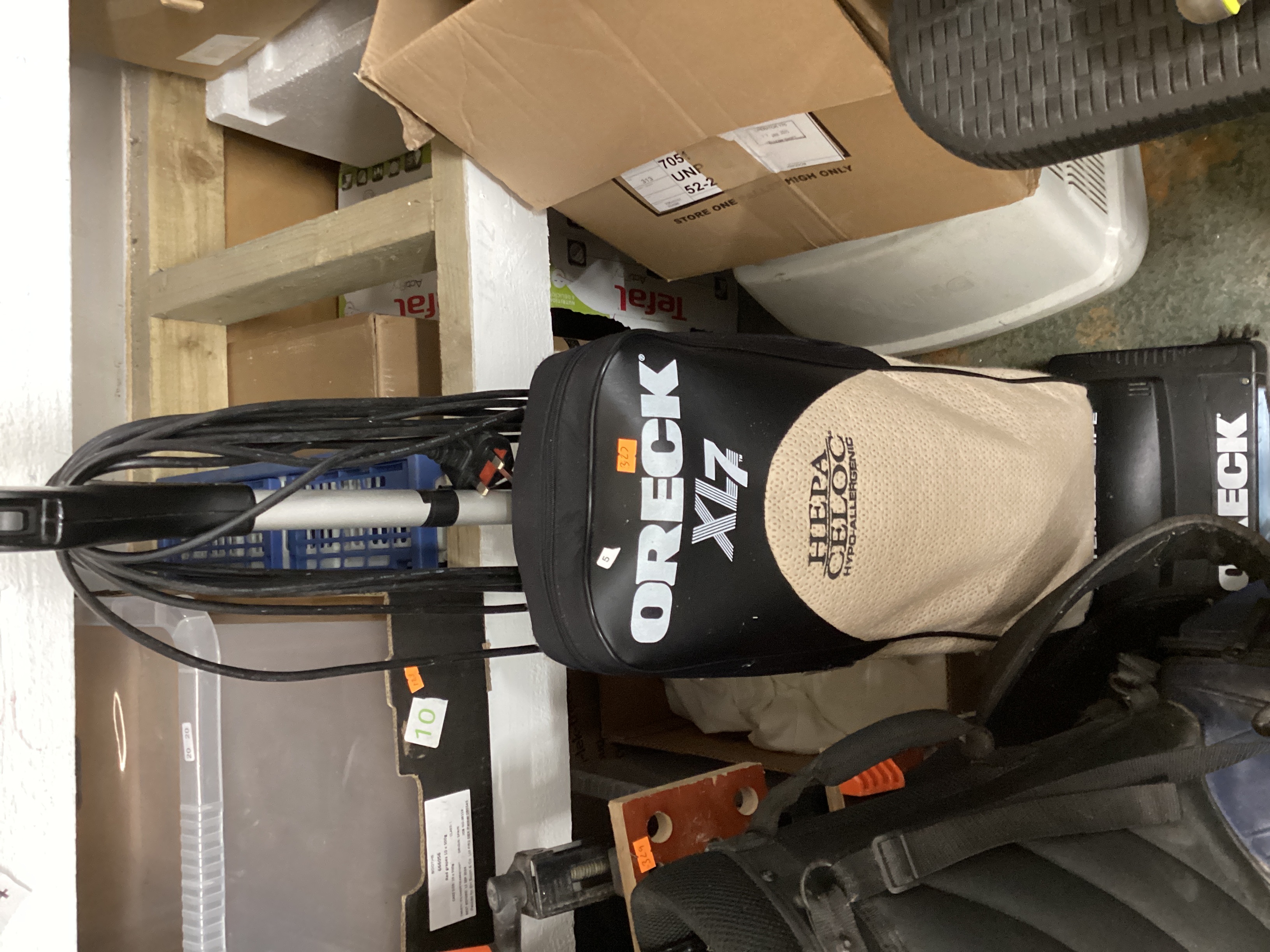 Oreck XL upright vacuum cleaner. Primarily constructed from black plastic with a silver-colored telescopic handle and a beige fabric dust bag. The bag is marked with “ORECK XL7” in white lettering and “HEPA CELOC HYPO-ALLERGENIC” in black. A UK-style three-pin power plug is fitted. The appliance is in used condition with some surface dust and minor scuffs consistent with use. No major damage or missing components are apparent. Small white and orange numerical stickers (“5” and “329”) are affixed to the dust bag.