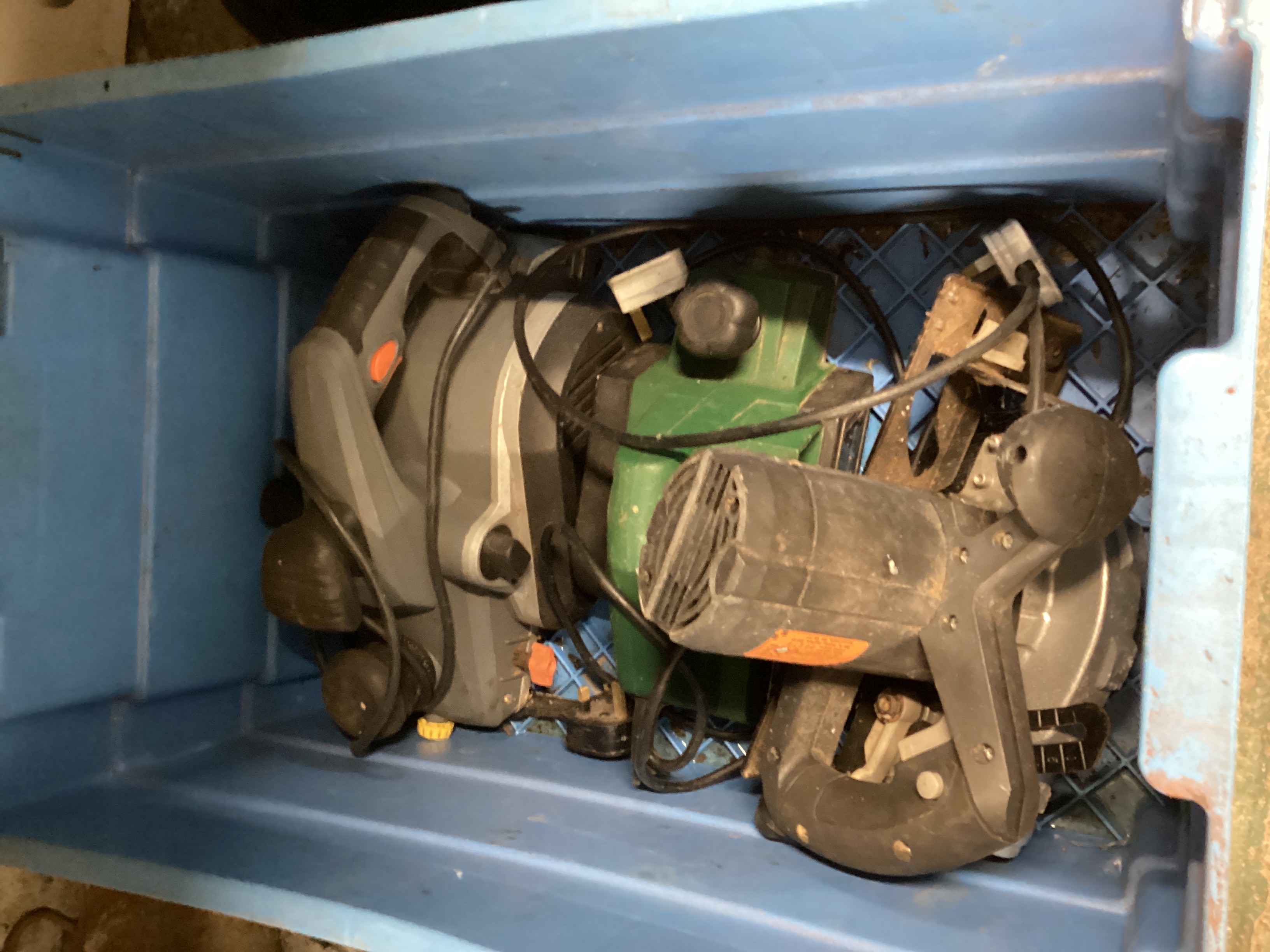 This lot contains a Bosch power planer, circular saw, and sander housed in a blue plastic utility crate. The tools appear used and exhibit dust, surface grime, and wear. The planer is grey, the circular saw is green, and the sander is black. An orange label is affixed to the black sander, but the text is illegible. Faint numerical markings are present on a smaller black accessory.