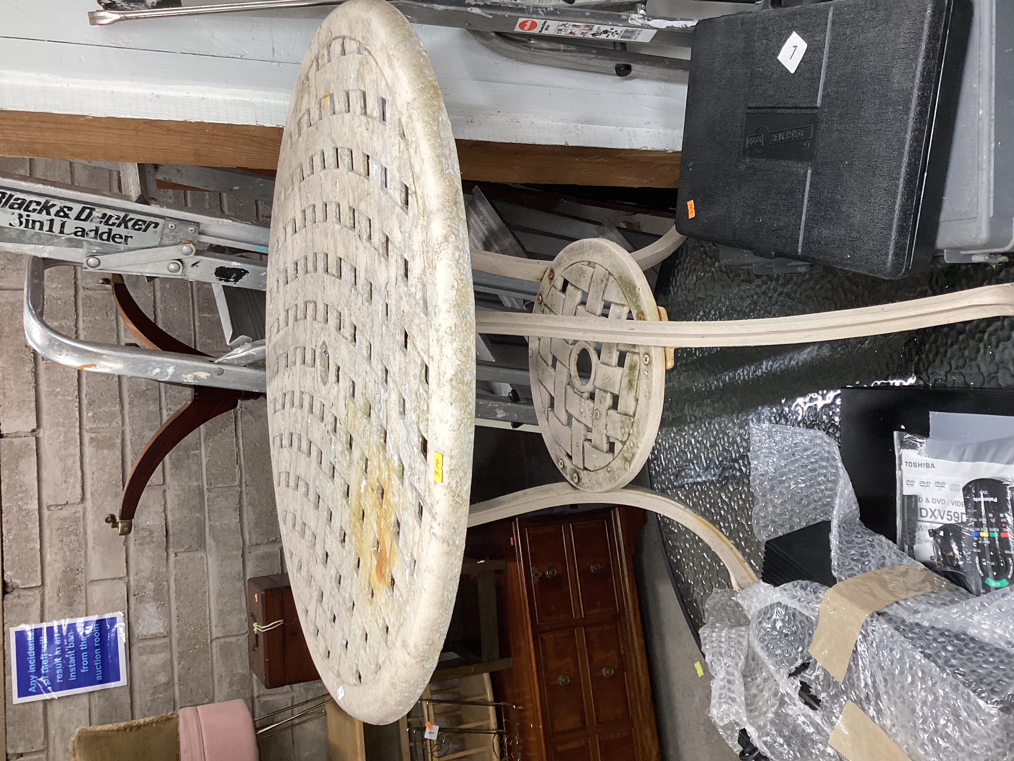 Cast aluminum patio table with a distressed off-white or cream painted finish. Features a basketweave-patterned top and lower stretcher, both with central umbrella holes. Exhibits significant discoloration, prominent orange-brown staining on the top, chipping of the paint, and visible green biological growth and surface oxidation.