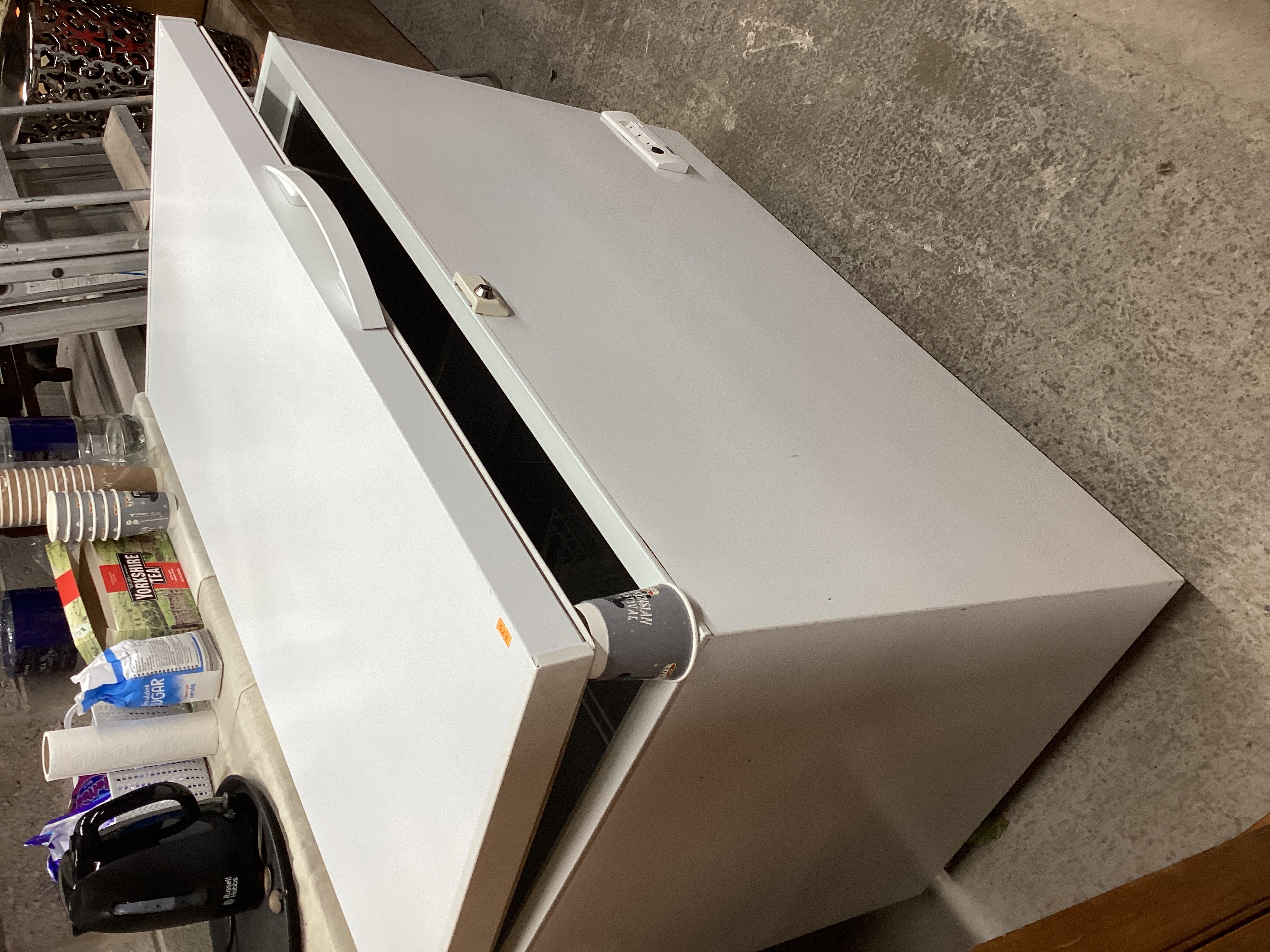 Chest freezer with a white-enameled or painted metal exterior and plastic lid handle and lock mechanism. A utility panel with controls is located on the lower right side. An orange sticker with a partially visible “3” is affixed to the front edge of the lid. The lid is slightly ajar. The freezer shows minor surface marks consistent with use.